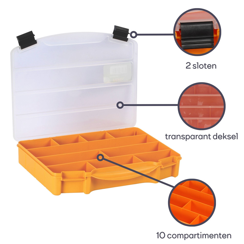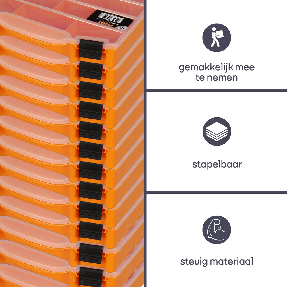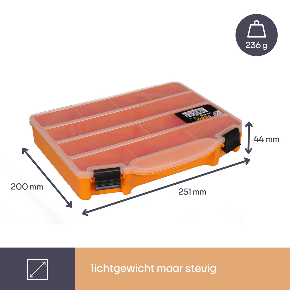 The 10-inch Perel assortment box is a durable plastic organizer, measuring 251 x 200 x 44 mm with a capacity of 2.2 liters. Its sturdy design is designed to hold up under various conditions, ensuring long-lasting use.