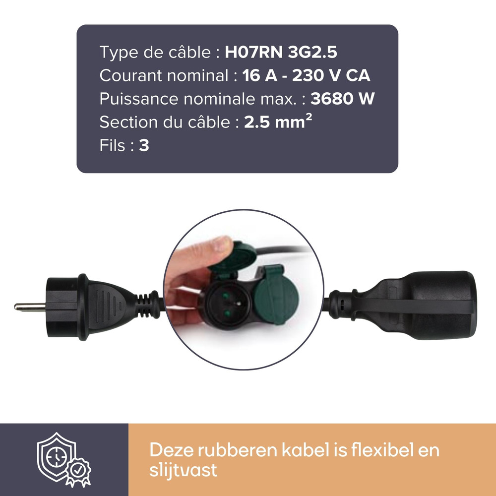 Built with 3G2.5 kabels, it offers optimal efficiency and durability, ensuring excellent performance even in demanding outdoor conditions. The pen-aarde feature adds an extra layer of safety by grounding the connection, minimizing electrical risks.