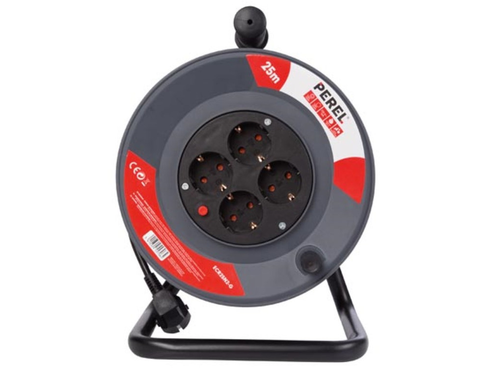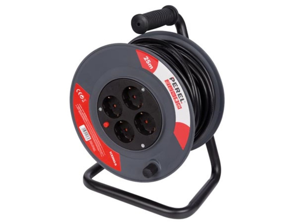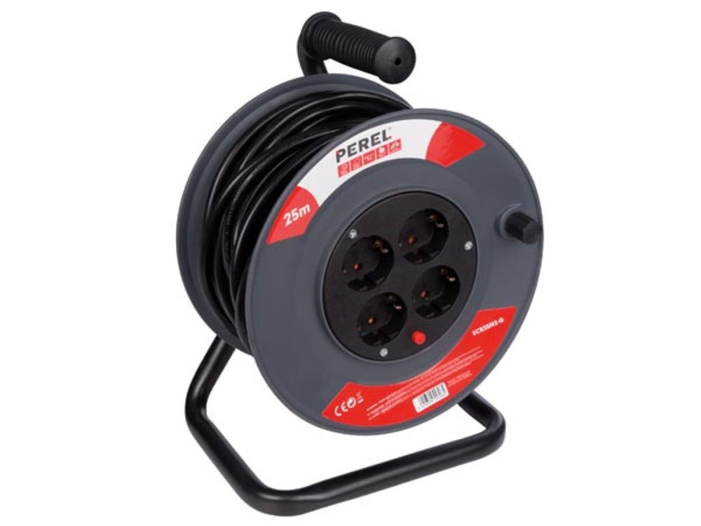 This 25-meter cable reel is designed to manage your power needs efficiently, featuring robust construction with a 3G1.5 cable configuration. It is equipped with four grounded sockets, offering safety and convenience for various electrical devices.