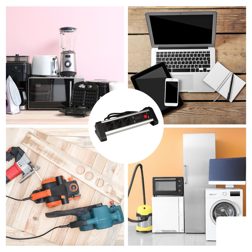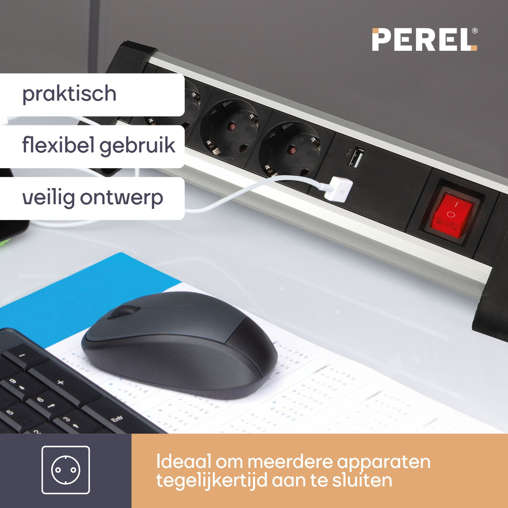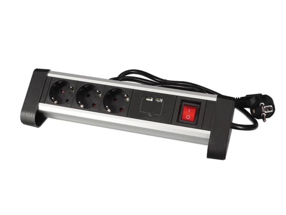 Krachtige en veelzijdige 3-voudige desktop-stekkerdoos met 2 USB-poorten van 2.4 A en randaarde. Ontworpen om naadloos in uw werkplekopstelling te integreren.