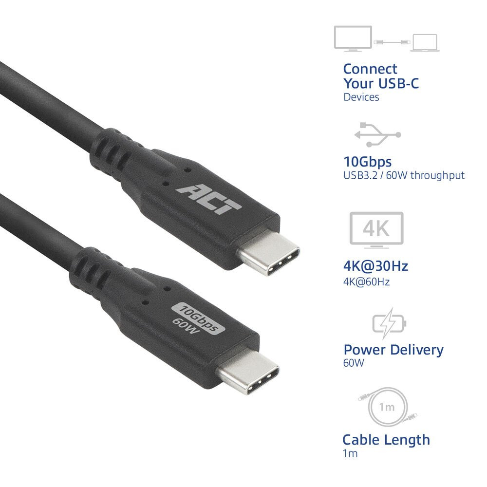 Experience seamless data transfer and fast charging with the ACT USB 3.0 cable. This robust USB-C to USB-C connection ensures speeds up to 10Gbps, making file transfers incredibly efficient.