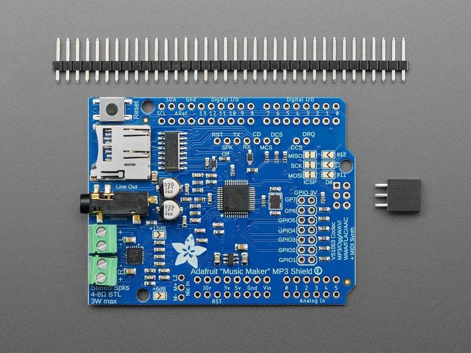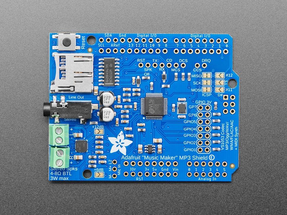 Bend all audio files to your will with the Adafruit Music Maker shield for Arduino! This powerful shield features the VS1053 codec chip, capable of decoding a wide variety of audio formats, including MP3, AAC, Ogg Vorbis, WMA, MIDI, FLAC, WAV, and more. Additionally, it records in PCM and Ogg Vorbis formats.