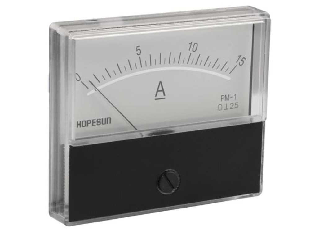 This analog panel meter is designed for DC current measurements up to 15A with dimensions of 70x60mm. It features a reliable moving coil mechanism, making it ideal for use in electronic instruments, switchboards, and vehicles.