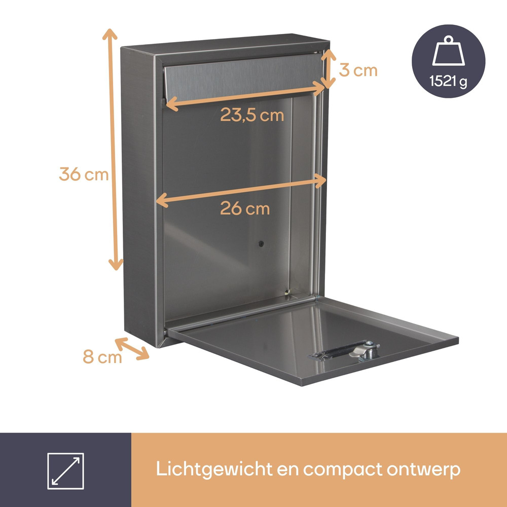 The BRIEVENBUS IBIZA INOX mailbox offers a sleek and sturdy solution with its stainless steel exterior. Measuring 36 x 26 x 8 cm, it fits seamlessly into any space, ensuring both style and function.
