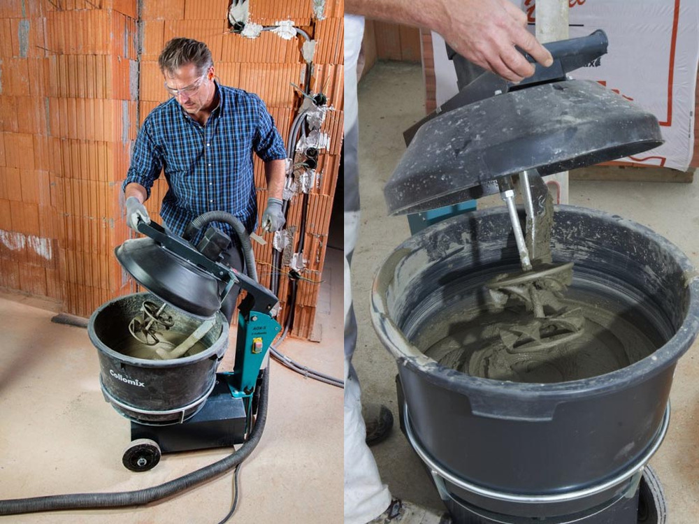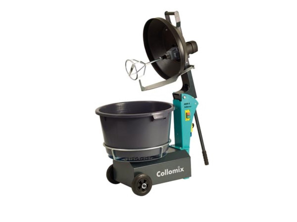 The Collomix rotatiemenger, type AOX-S, features a 40 L capacity designed for all-around performance. It includes a special 65-liter mixing bucket that rotates around a high-speed central mixing paddle, ensuring thorough and consistent blends.