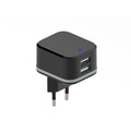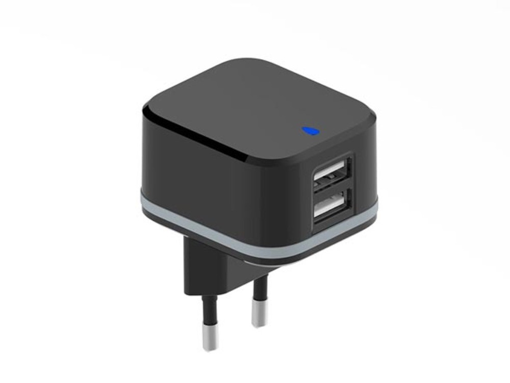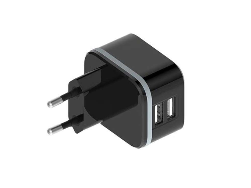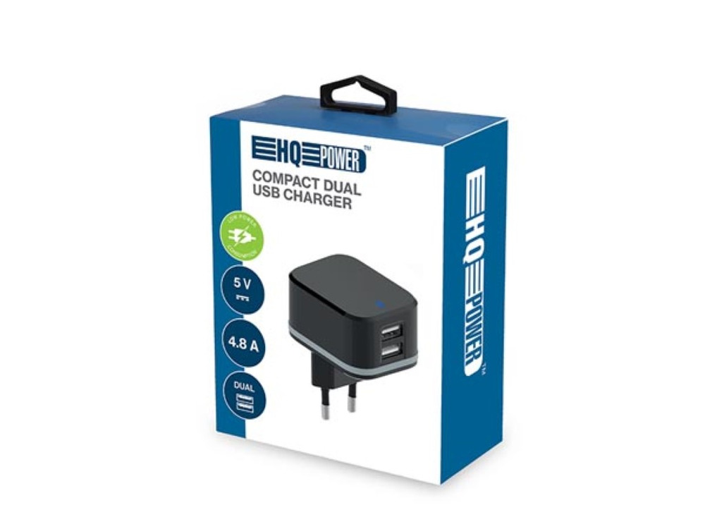 The compact charger with dual USB ports delivers a powerful performance with ease. This sleek, black device provides 5 volts, up to 4.8 amps, and a maximum power of 24 watts, ensuring efficient energy transfer with every connection.