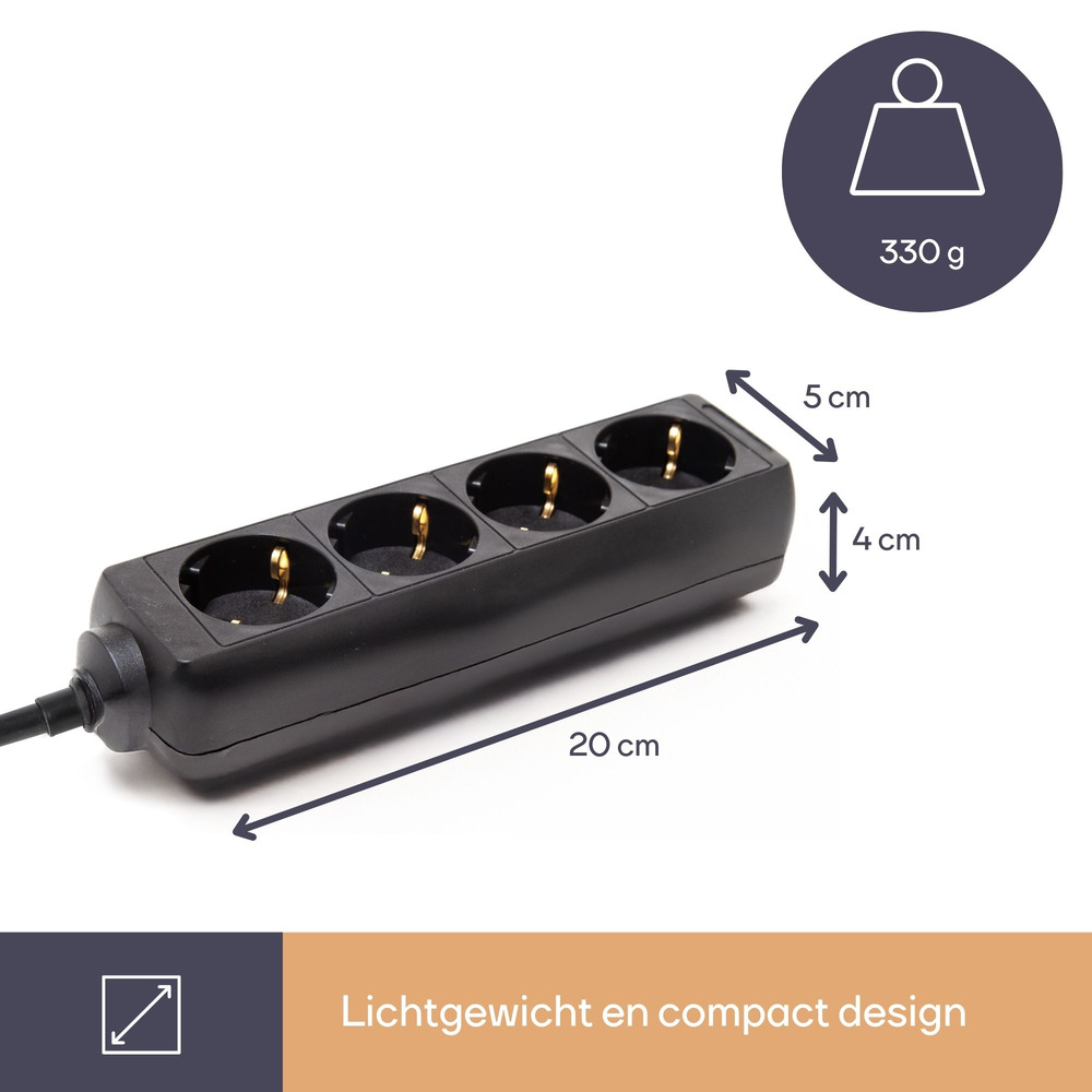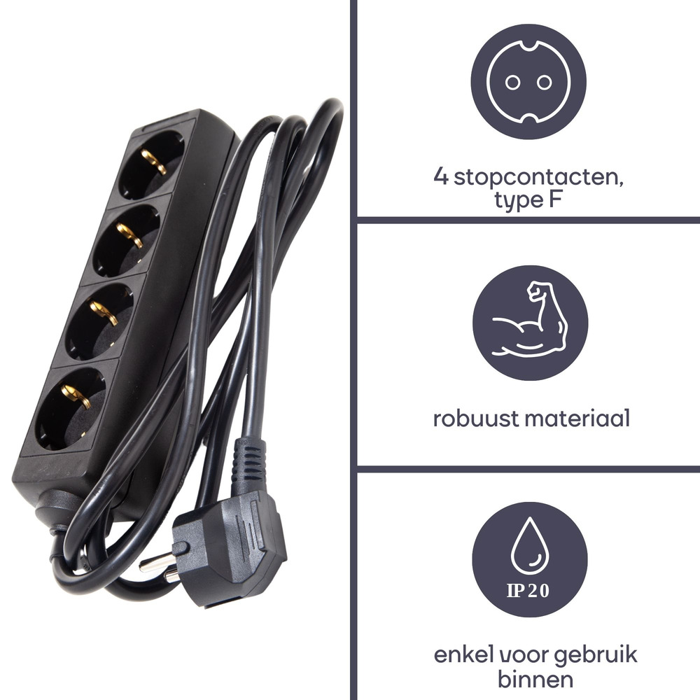 The CONTACTDOOS MET 4 STOPCONTACTEN provides a reliable power solution with its 1.5-meter cable and sleek black design, seamlessly blending into any environment. Equipped with four grounded outlets, it ensures safe and efficient power distribution for your devices, reducing clutter and optimizing space.