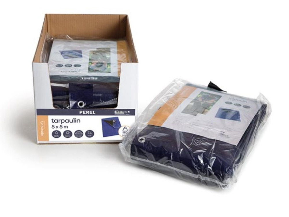 The Dekzeil tarp stands out for its robustness, offering a durable solution with its blue and black design. Measuring 5 x 5 meters, it's crafted for maximum strength to withstand diverse weather conditions.