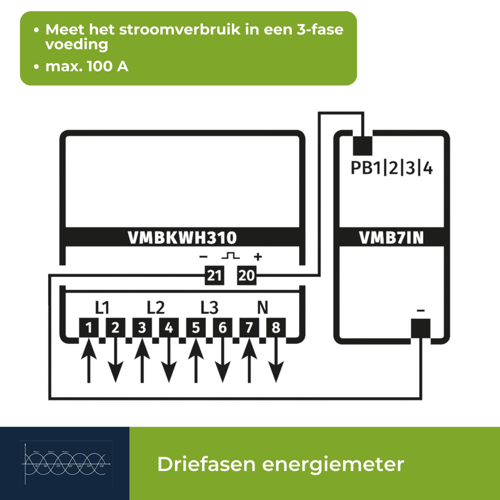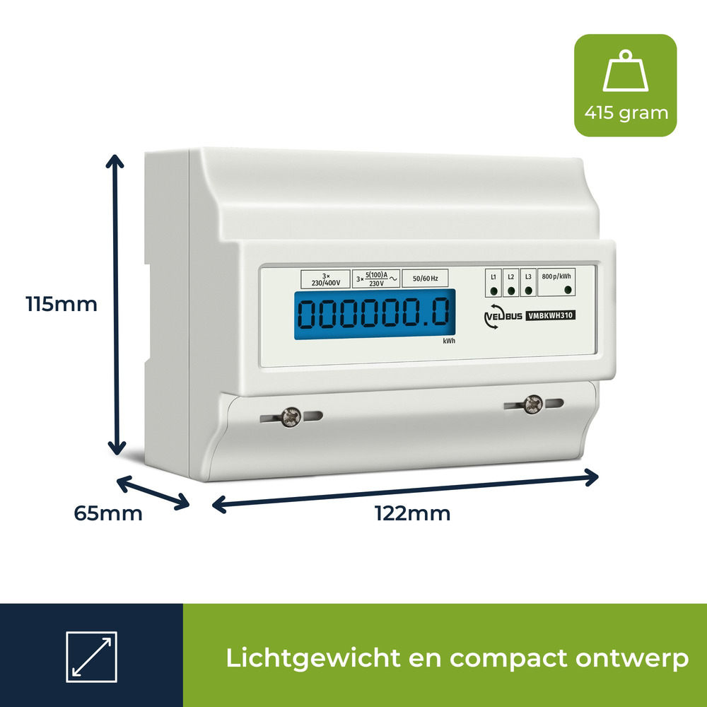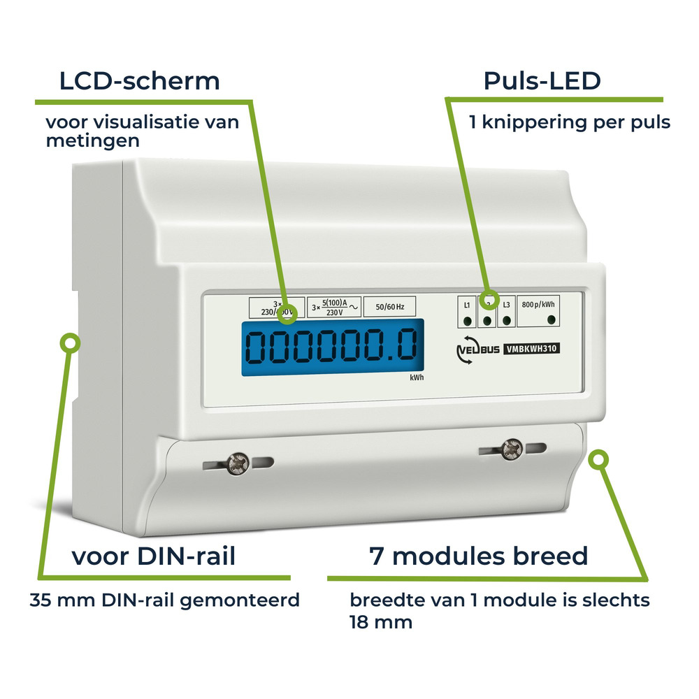 Driefasige kWh-meter voor DIN-rail montage, bestaande uit 7 modules, ideaal voor professioneel gebruik. Deze elektronische meter met impulsuitgang biedt een uitstekende combinatie van nauwkeurigheid, betrouwbaarheid en compactheid.