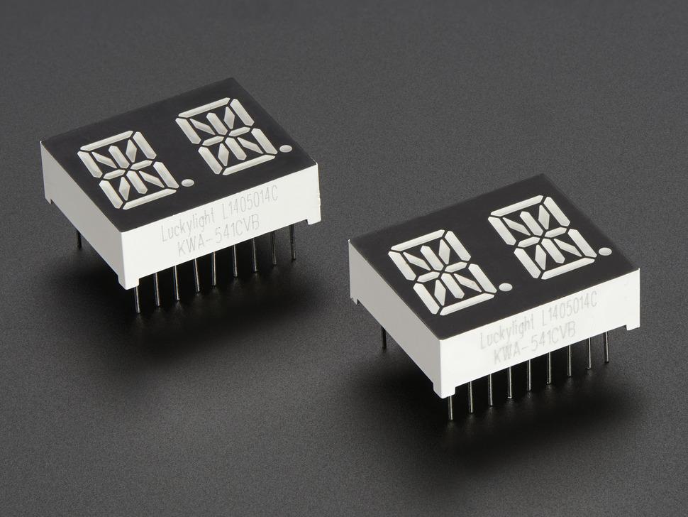 Digits have seven white segments on a black surface and we give you a set of two alphanumeric displays in a pack so you can make a clock or a four letter word. These are 14mcd bright. You can drive these with less current to get the same brightness to save power, or crank them up to 20mA and have them at their brightest.