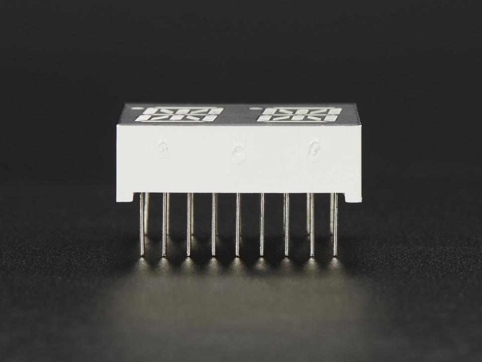 There are nine pins per side on these, so 18 pins total, with 0.1" spacing so you can easily plug it into a breadboard with one row on each side for wiring it up. Note that these may not color-match our other green 7-segment displays due to process differences. You can buy these as a set of two or in a pack with our Adafruit 14-segment LED Alphanumeric Backpack which will help you change each letter or number individually and easily. This product is just the two green alphanumeric displays!