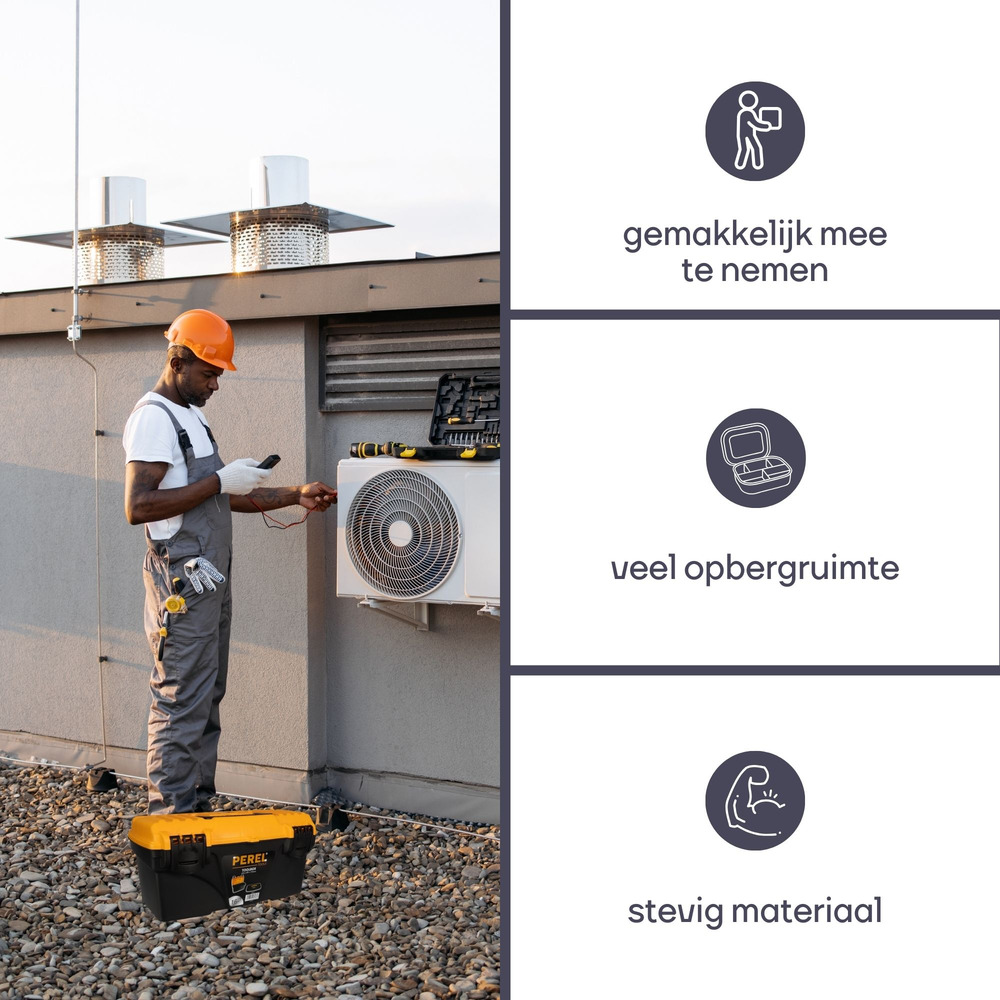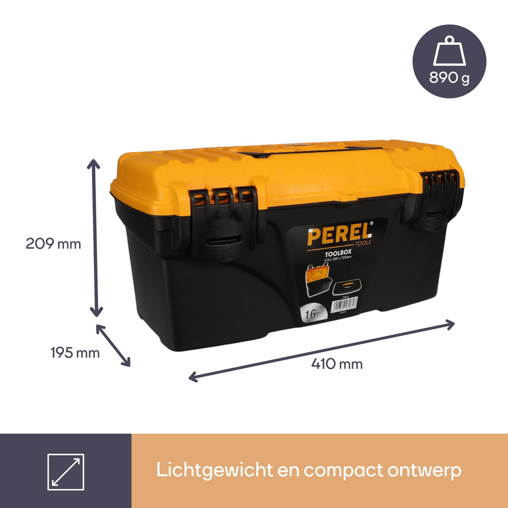 De gereedschapskoffer met afmetingen van 410 x 209 x 195 mm en een inhoud van 16,7 liter biedt efficiënte opbergruimte voor verschillende gereedschappen.
