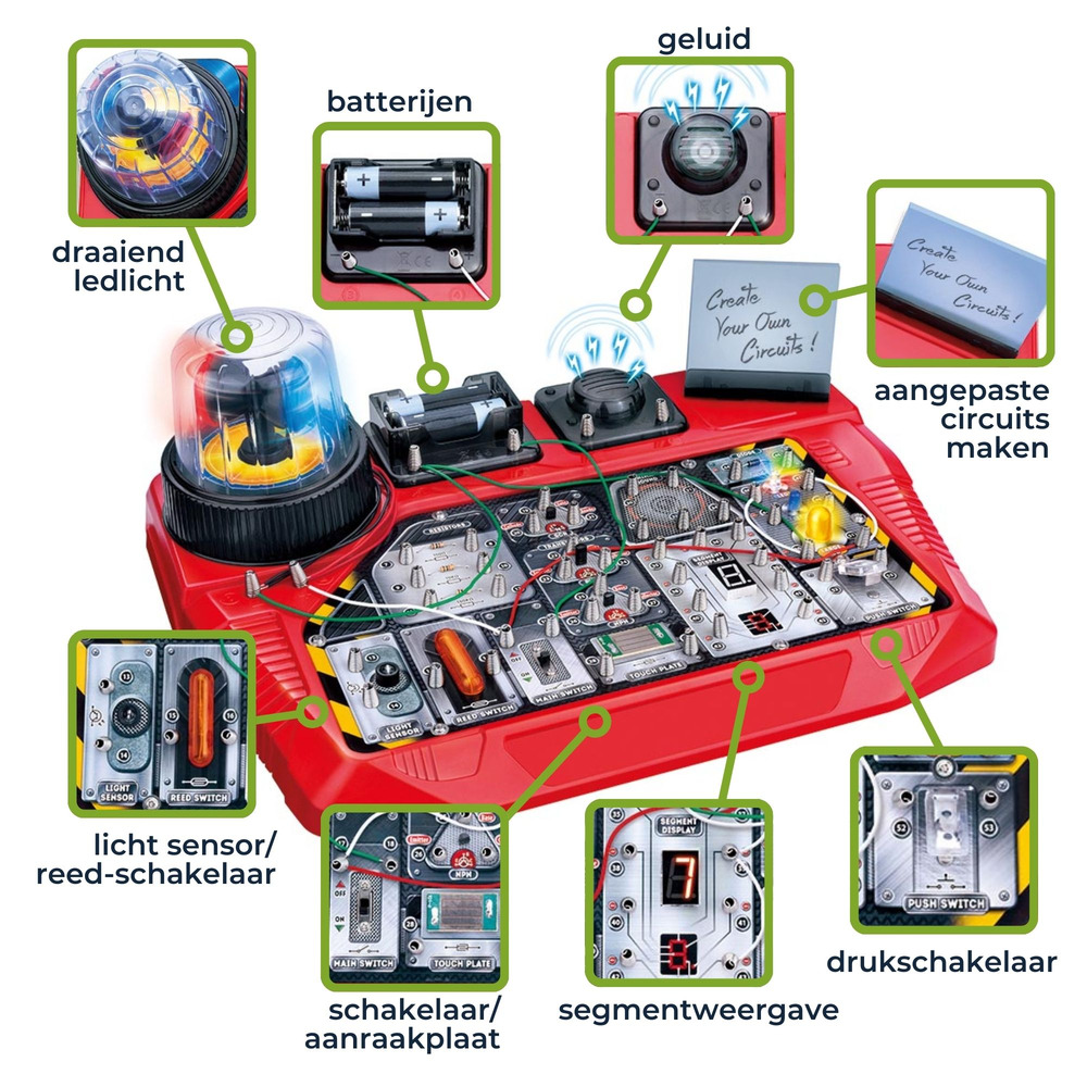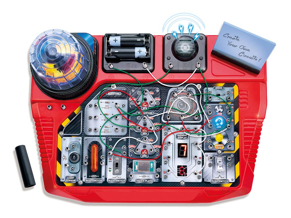 Specifications include resistors, capacitors, transistors, and switches, all organized in a user-friendly layout. Experiment with diodes and capacitors to build simple sound-detecting circuits or design a light-controlled switch.
