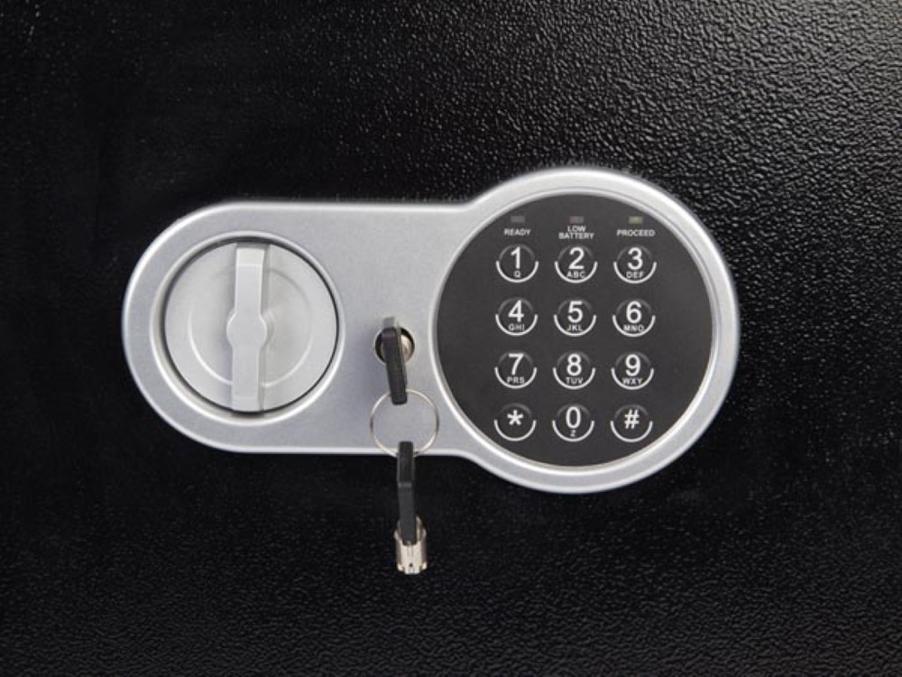 The safe is equipped with an intuitive digital keypad, offering quick access through a customizable code. In case of forgotten codes, the included master key provides an alternative entry method.