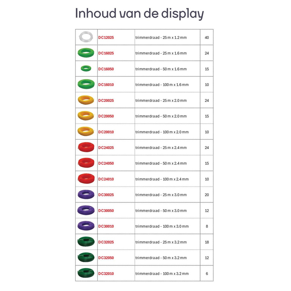 This elegant wooden display comes fully stocked with trimmer line, featuring 16 distinct references for all your trimming needs. Thoughtfully crafted, the display ensures easy access and categorization. Whether tackling small garden tasks or larger landscaping projects, this versatile set accommodates various trimming applications with precision and reliability.