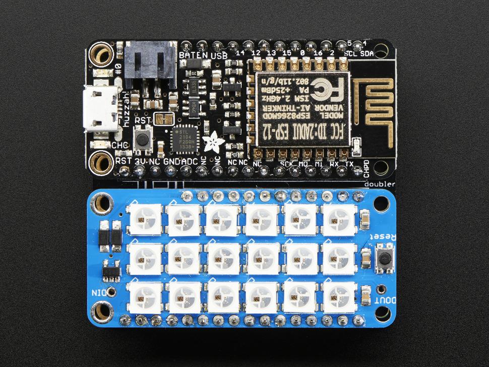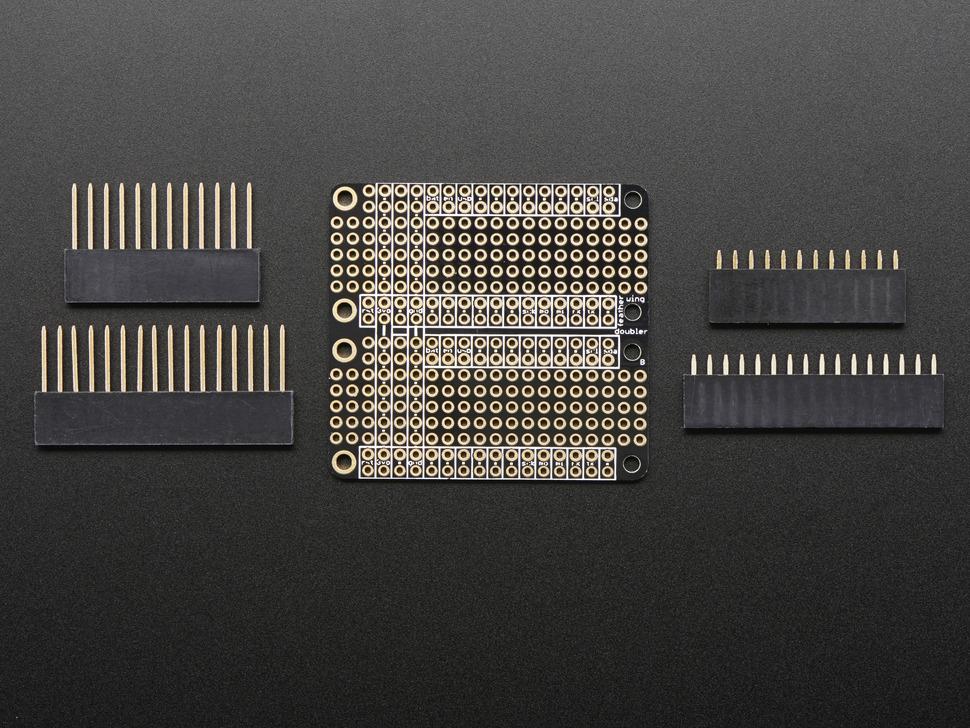 Included with the Doubler are essential components: 1 Doubler PCB, 1 set of Feather Stacking Headers, and 1 set of Feather Female Headers. Customize your build for a slimmer appearance by trimming the stacking headers post-soldering.