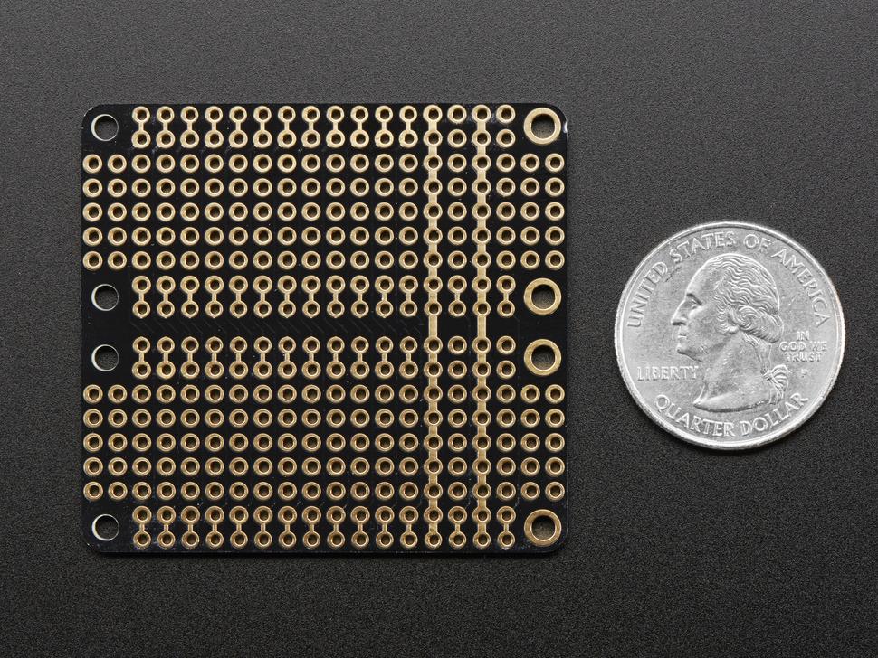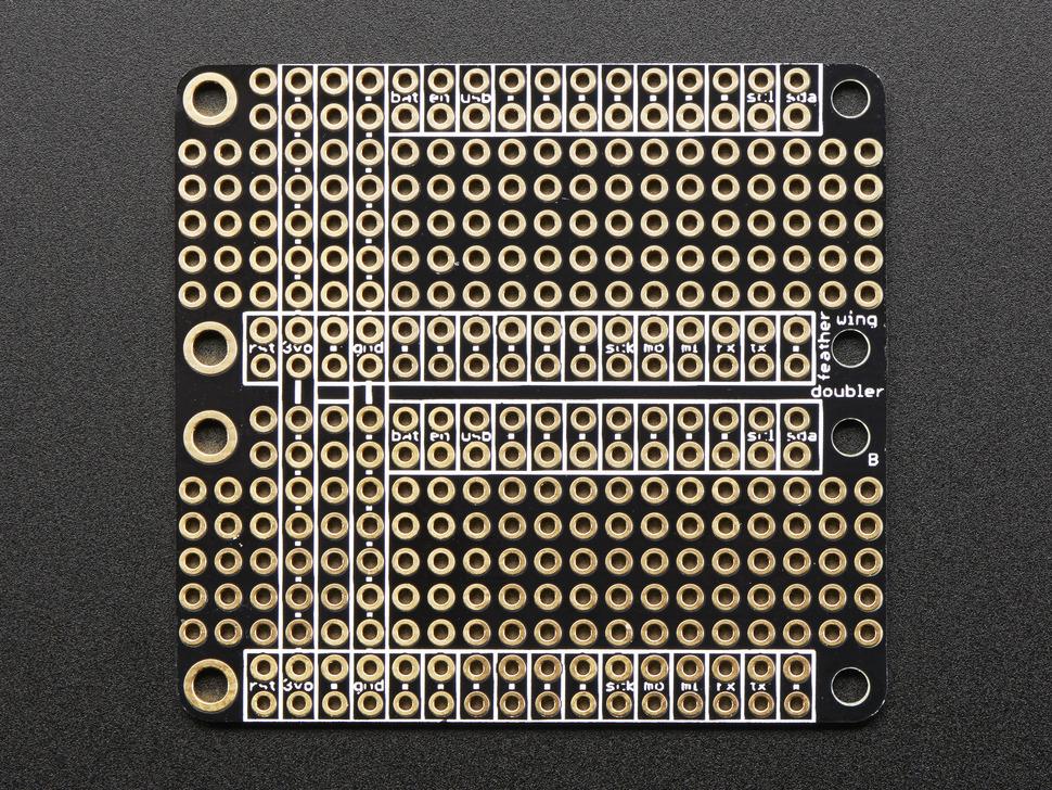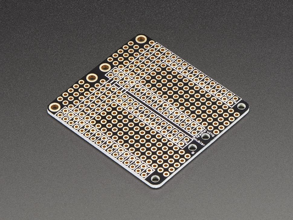 The Doubler features duplicate breakouts for each Feather pin, enhanced by a grid of proto holes. Cross-connected pins ensure seamless integration, with full strips for GND and 3.3V connections, making prototyping both efficient and versatile.