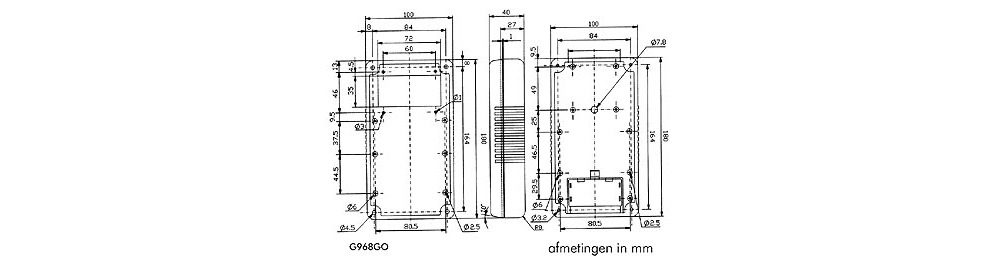 De draagbare behuizing, grijs van kleur en met afmetingen 180 x 100 x 43mm, biedt een open display dat lijkt op dat van een grote multimeter. Deze veelzijdige behuizing is voorzien van een handig batterijvak.