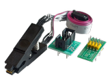 This test clip fits perfectly on SOIC8 and DIP8 chips, so they do not have to be removed from the circuit for programming. This clip is attached to a band cable, which can be clicked on the supplied adapters to make a DIP8 connection, which can easily be placed on a programmer.