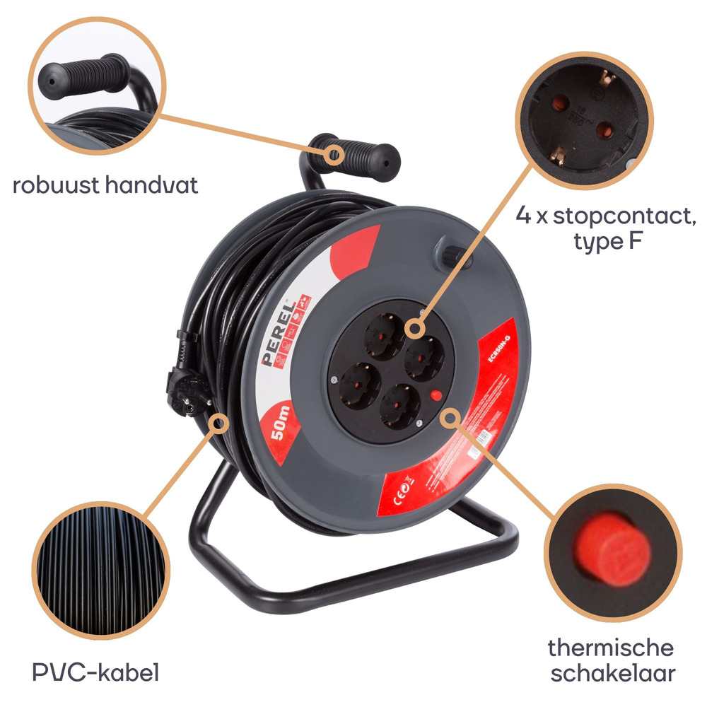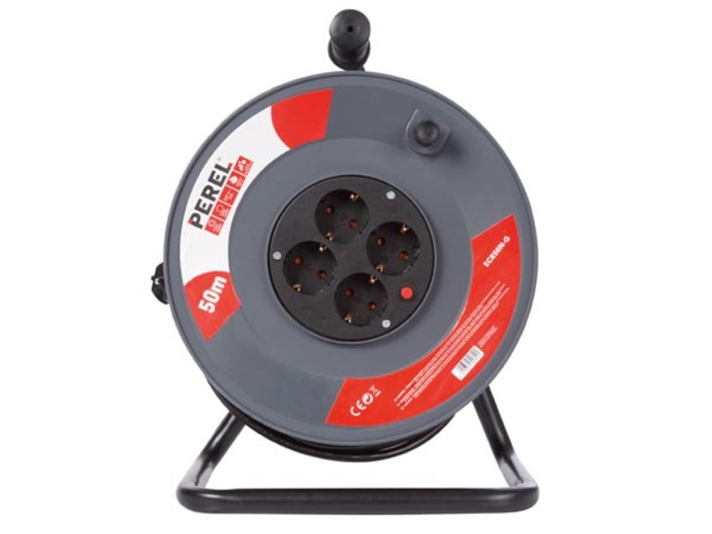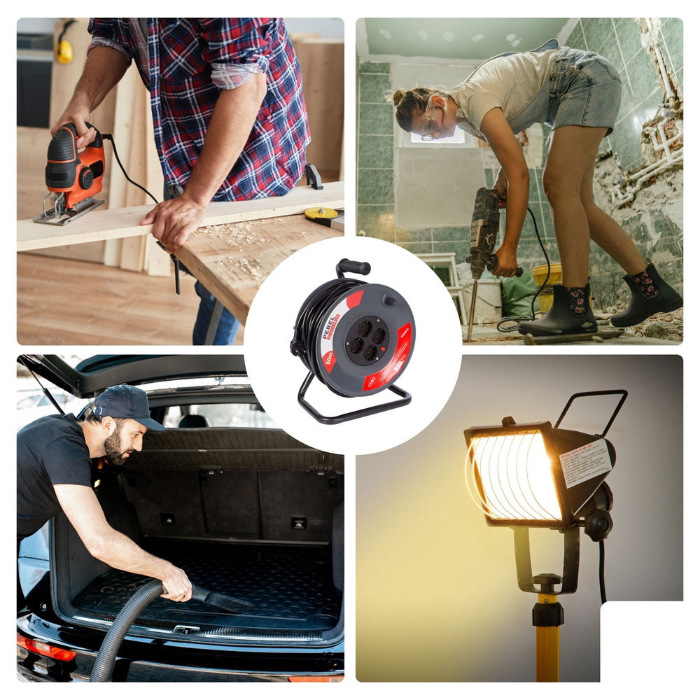 With its 50-meter length, this cable reel provides extensive reach for projects requiring flexibility and distance. Its four outlets allow simultaneous connection for a range of tools, reducing the need for multiple extension cords.