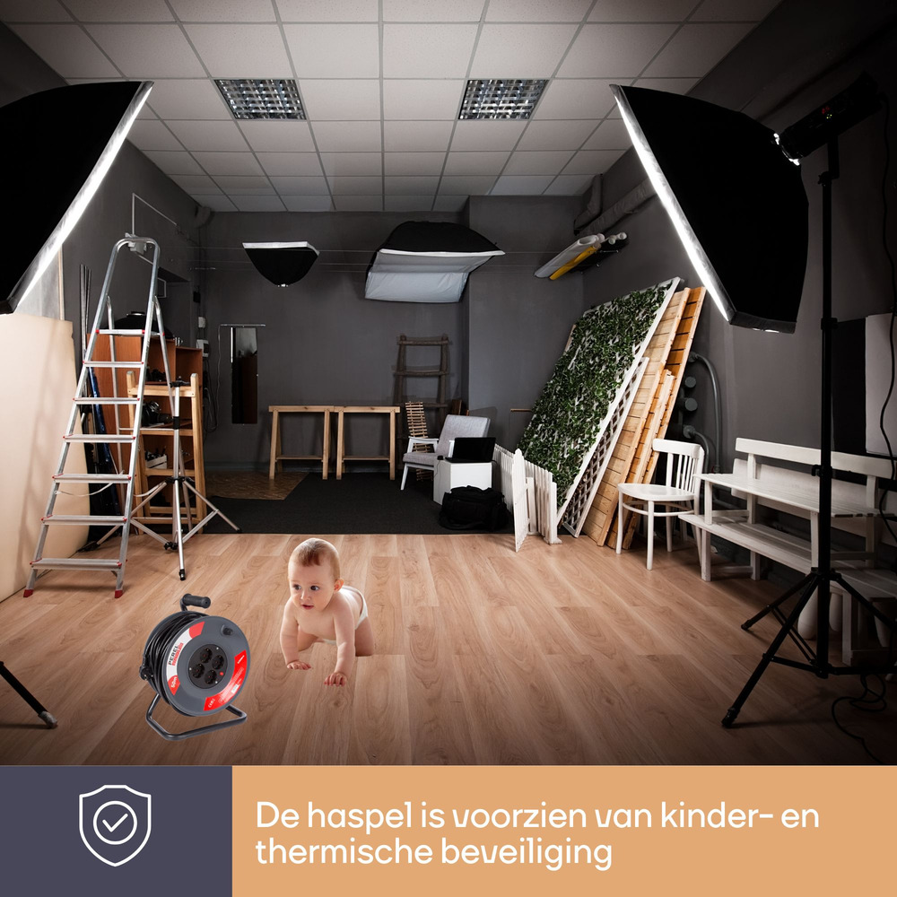 The Kabelhaspel 50 m is a robust and reliable cable reel designed for heavy-duty use. Equipped with 3G1.5 cabling and four grounded outlets, it ensures efficient power distribution for multiple devices.