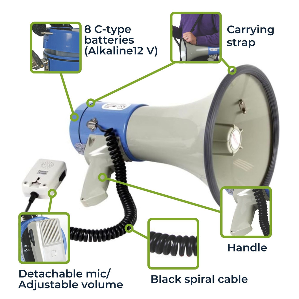 Made with durable ABS plastic, the megaphone promises robustness and longevity. With an included shoulder strap, it is designed for convenient portability.