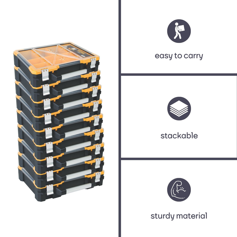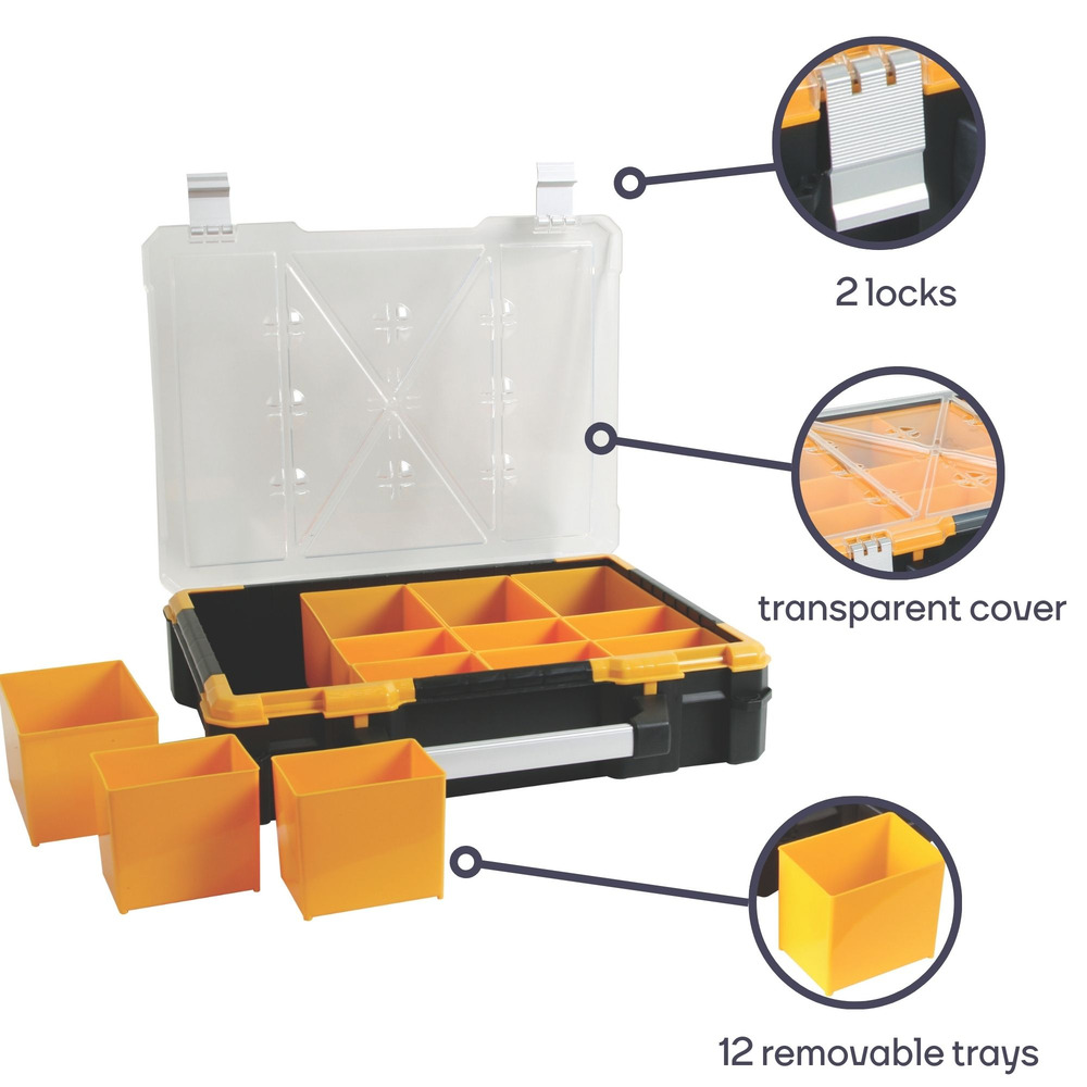 Equipped with a transparent lid, the contents remain visible while staying securely in place. The two aluminum closures ensure the case remains firmly shut, safeguarding your items even if all compartments are not in use.