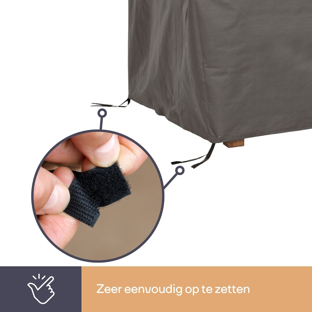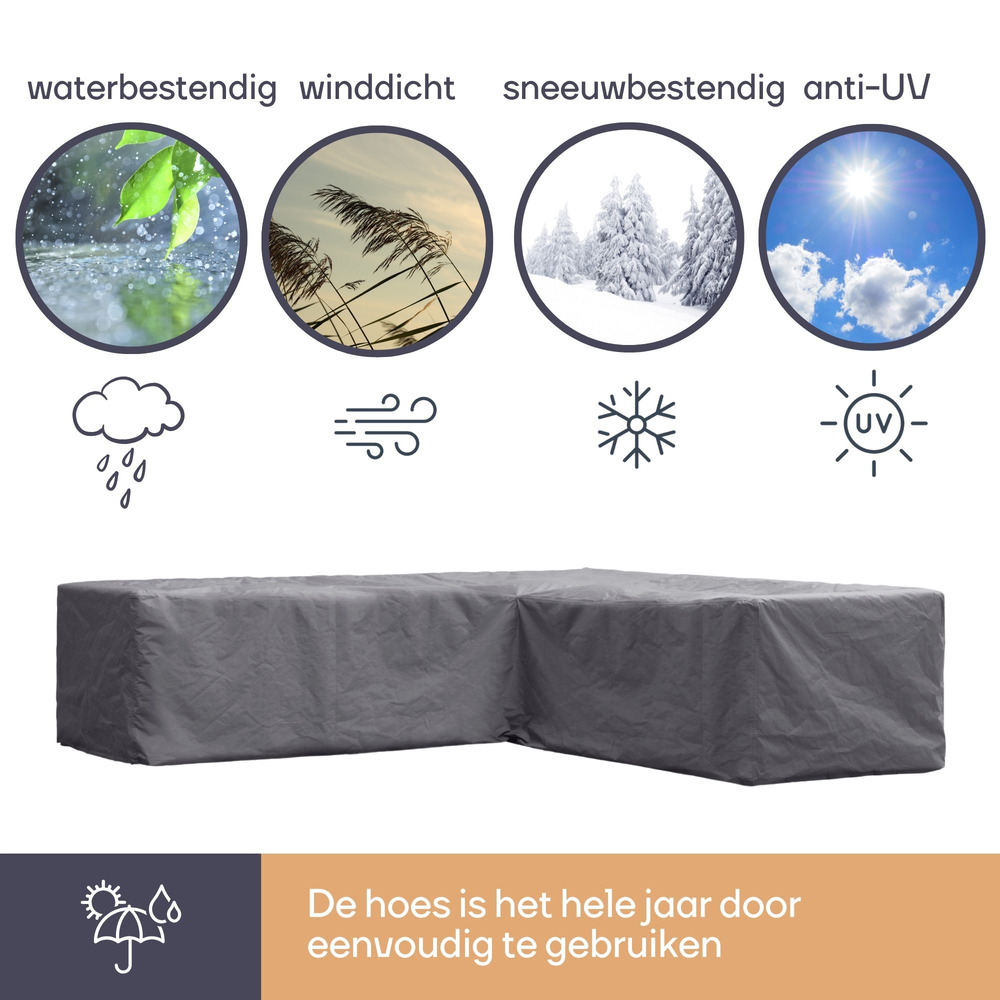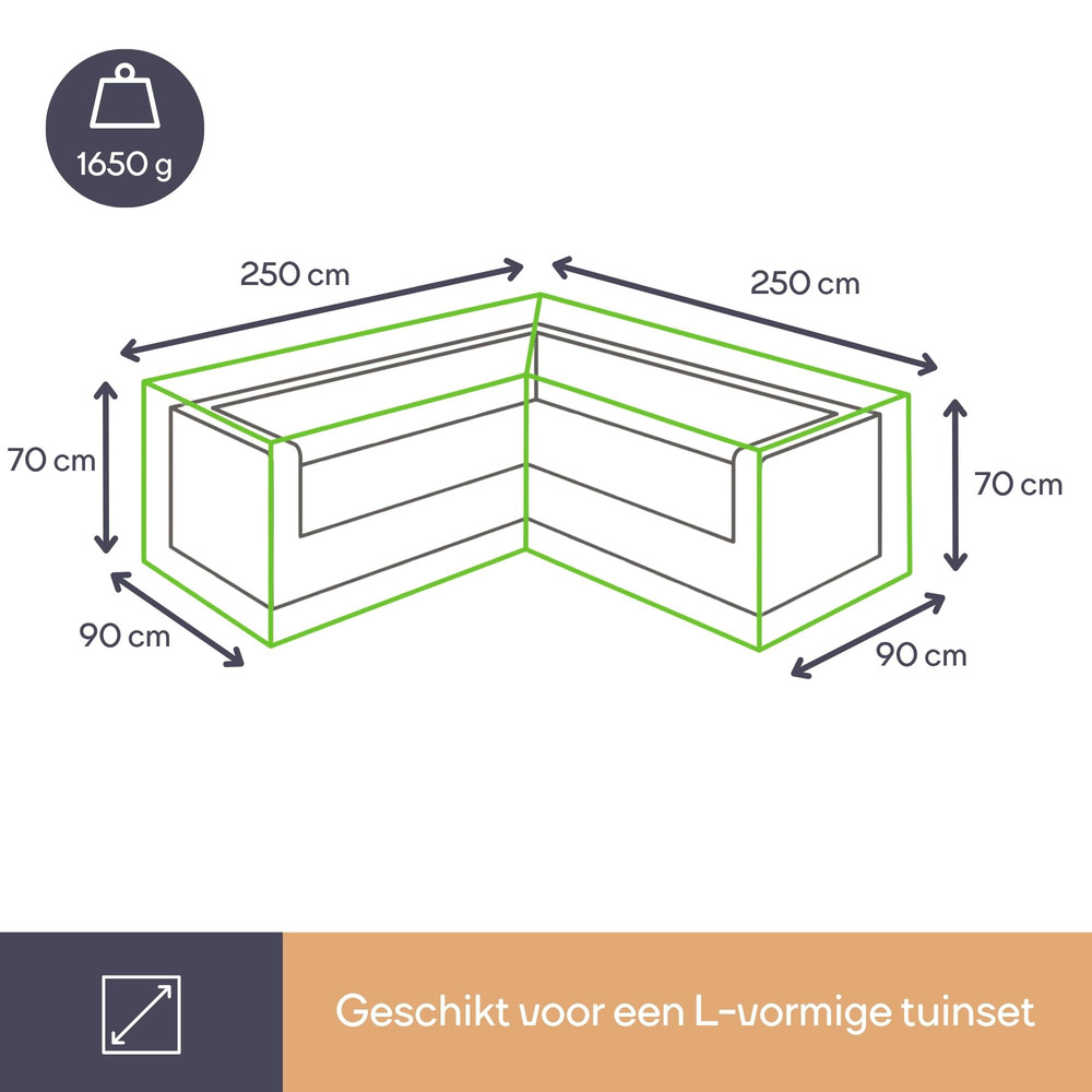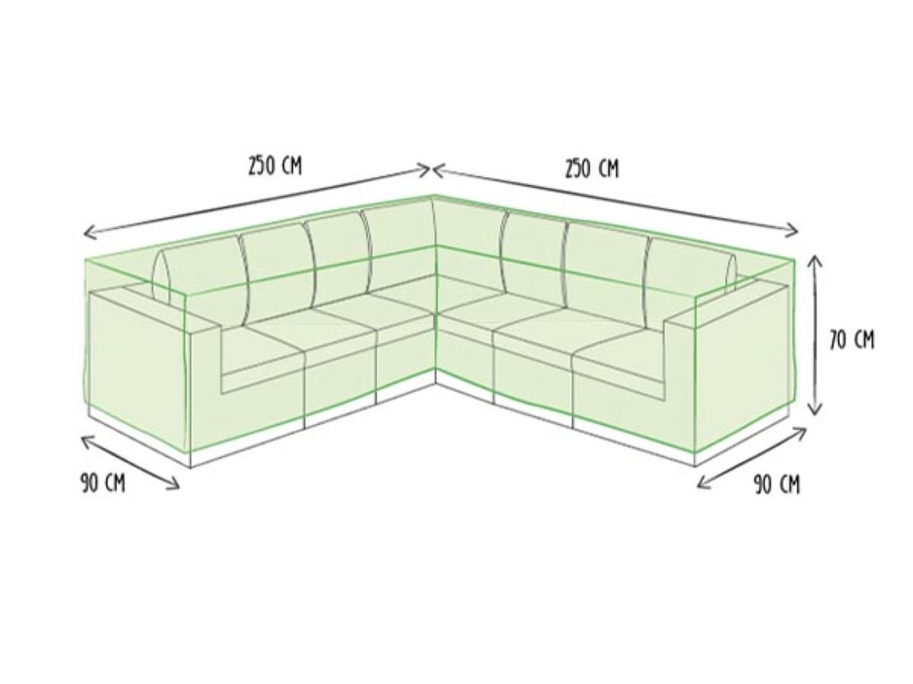 Shield your L-shaped lounge set from the elements with this outdoor cover, measuring 250x250x70cm. Designed to fit seamlessly over your furniture, it offers robust weather resistance, safeguarding against rain, dust, and sunlight.