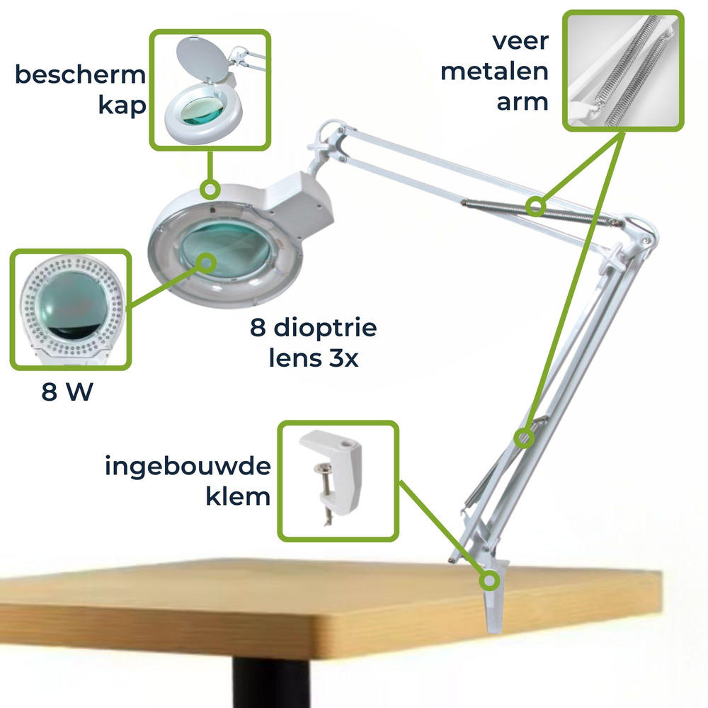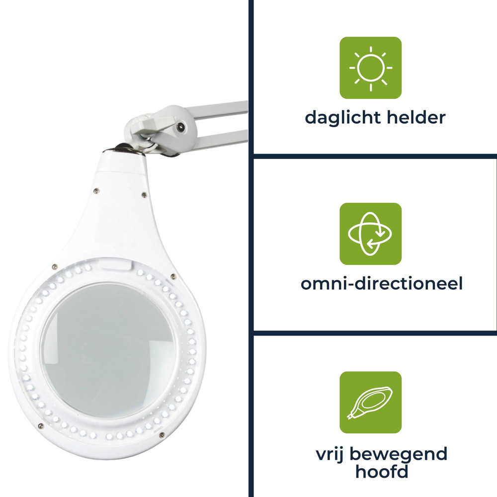 De LED bureauwerklamp met vergrootglas bevat een 8-dioptrie lens, perfect voor nauwkeurig werk thuis of op kantoor. De 60 heldere witte LEDs zorgen voor uitstekende verlichting terwijl het energieverbruik laag blijft op slechts 8 W.