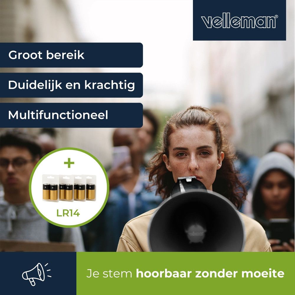 Powered by 8 LR14 1.5V alkaline-C batteries, this megaphone promises long-lasting performance, allowing for extended periods of use without frequent battery changes.