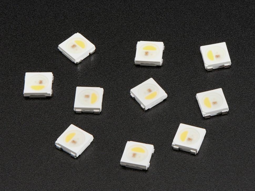 The RGB+Warm White version comes with ten individual 5050-sized (5mm x 5mm) SMD LEDs, allowing for flexible arrangements. Each LED acts like a shift register with an embedded microcontroller, facilitating complex control and customization.