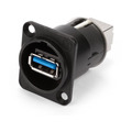 The NEUTRIK NAUSB3-W is a reversible USB 3.0 gender changer, featuring Type A and B connections within a sleek, black, nickel-plated D-shaped housing. This adapter seamlessly fits into standard patch panels, enhancing connectivity solutions.