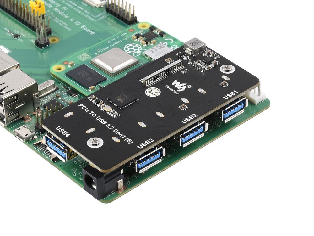 The PCIe TO USB 3.2 Gen1 Adapter seamlessly upgrades connectivity for your Raspberry Pi Compute Module 4 IO Board.