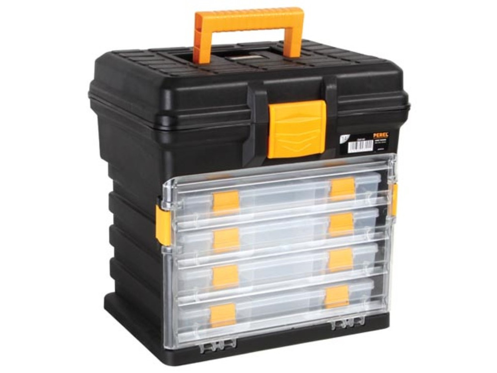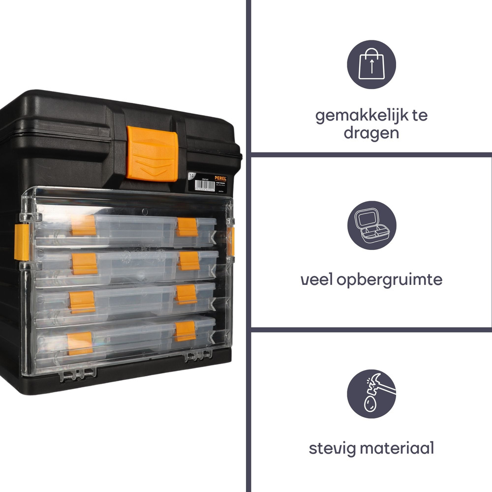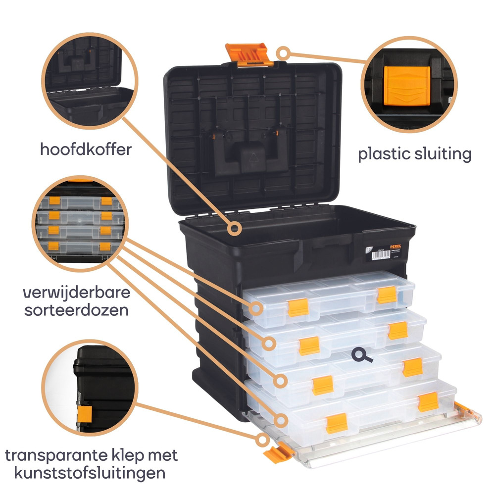 Experience the convenience of the 14" Opbergkoffer by Perel, measuring 340 x 272 x 341 mm with a 31.5 L capacity. This practical storage solution features four extendable and removable transparent sorting boxes, making organization a breeze.