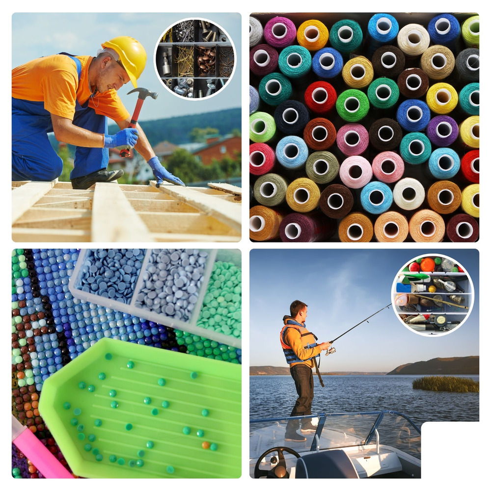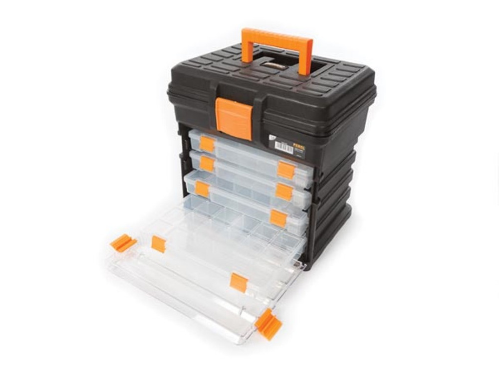 Its robust plastic closures secure contents during transport, and the collapsible handle provides ease of carrying. Perfect for organizing tools, craft supplies, or any items requiring systematic storage, this versatile case adapts to various storage needs seamlessly.