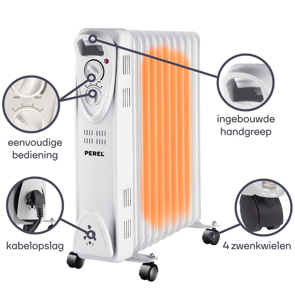 This 2000 W Perel oil-filled radiator is equipped with 9 ribs and is perfect as an auxiliary heater. Featuring three heat settings and a thermostat, it provides customizable warmth. The heated oil continues to emit warmth even after the unit is turned off, with no need for oil replacement.