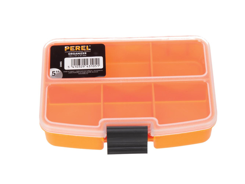 The Perel 5" assortments box measures 134 x 101 x 31 mm and holds up to 0.4 liters, offering a compact yet efficient storage solution. Designed with six fixed compartments, it helps you organize small items and accessories with ease.