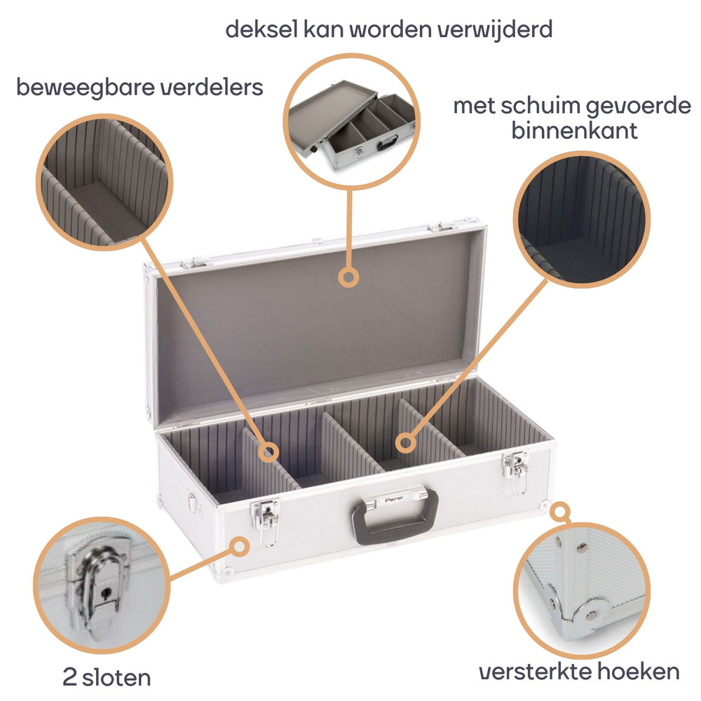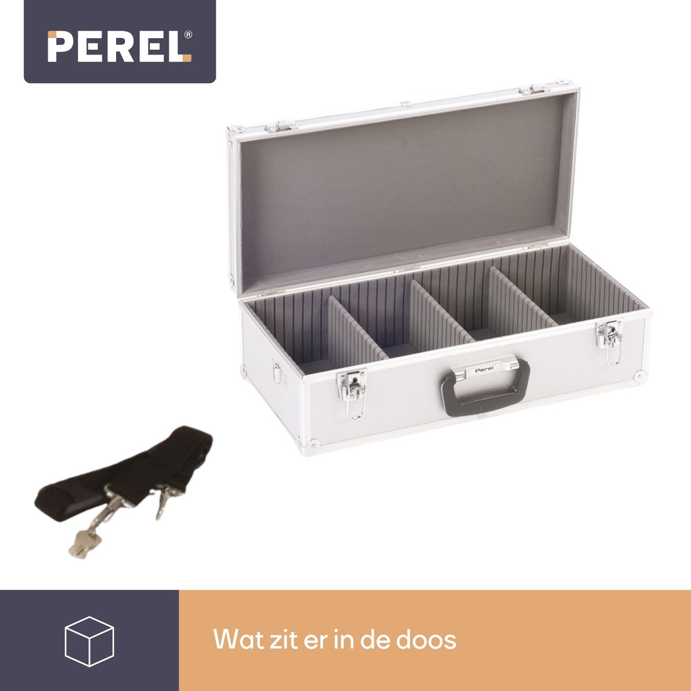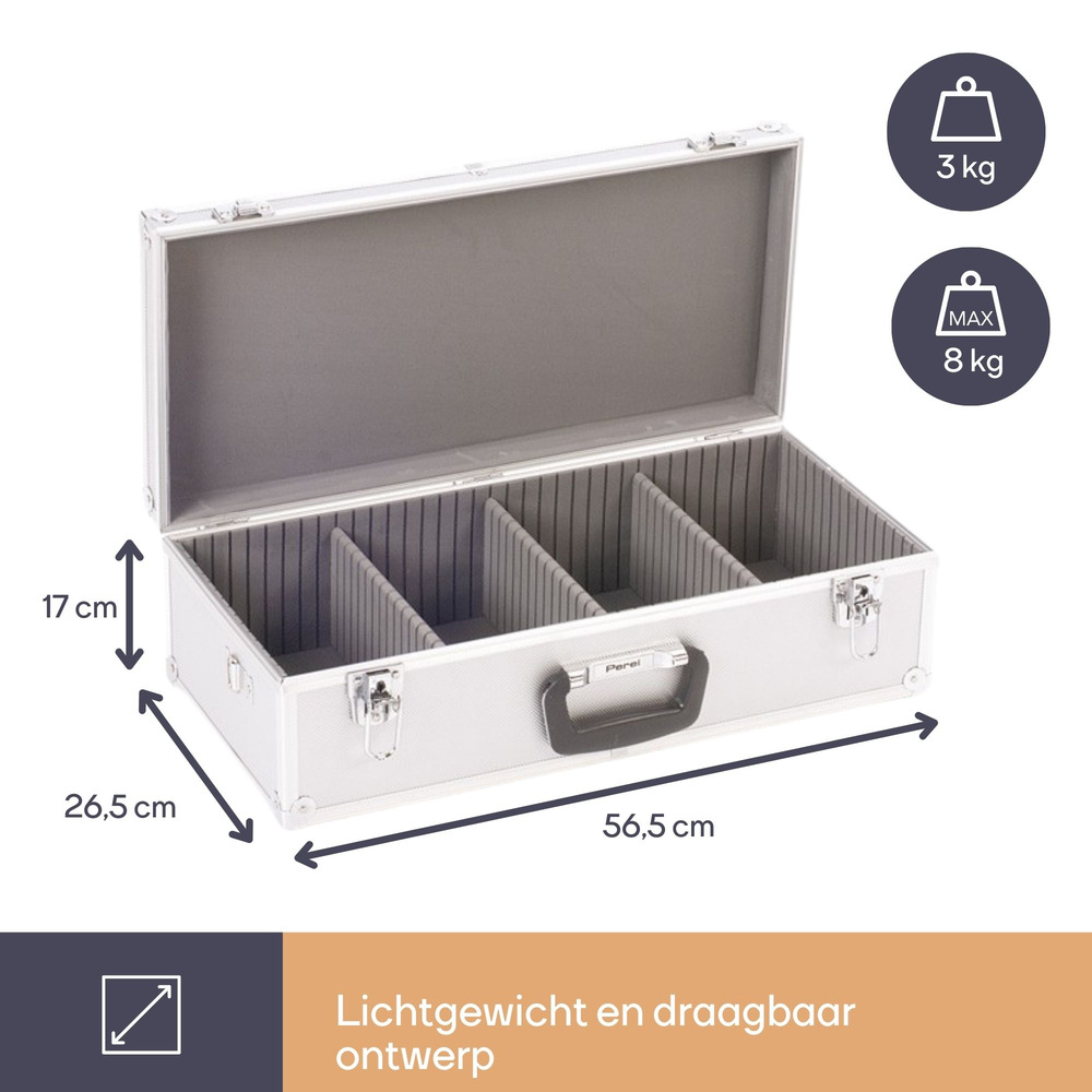 Deze aluminium CD-koffer van Perel heeft afmetingen van 565 x 265 x 170 mm en biedt een inhoud van 25,4 liter, geschikt voor het opbergen van 80 CD's. De beklede binnenkant zorgt voor bescherming van de CD's tegen krassen en schokken.