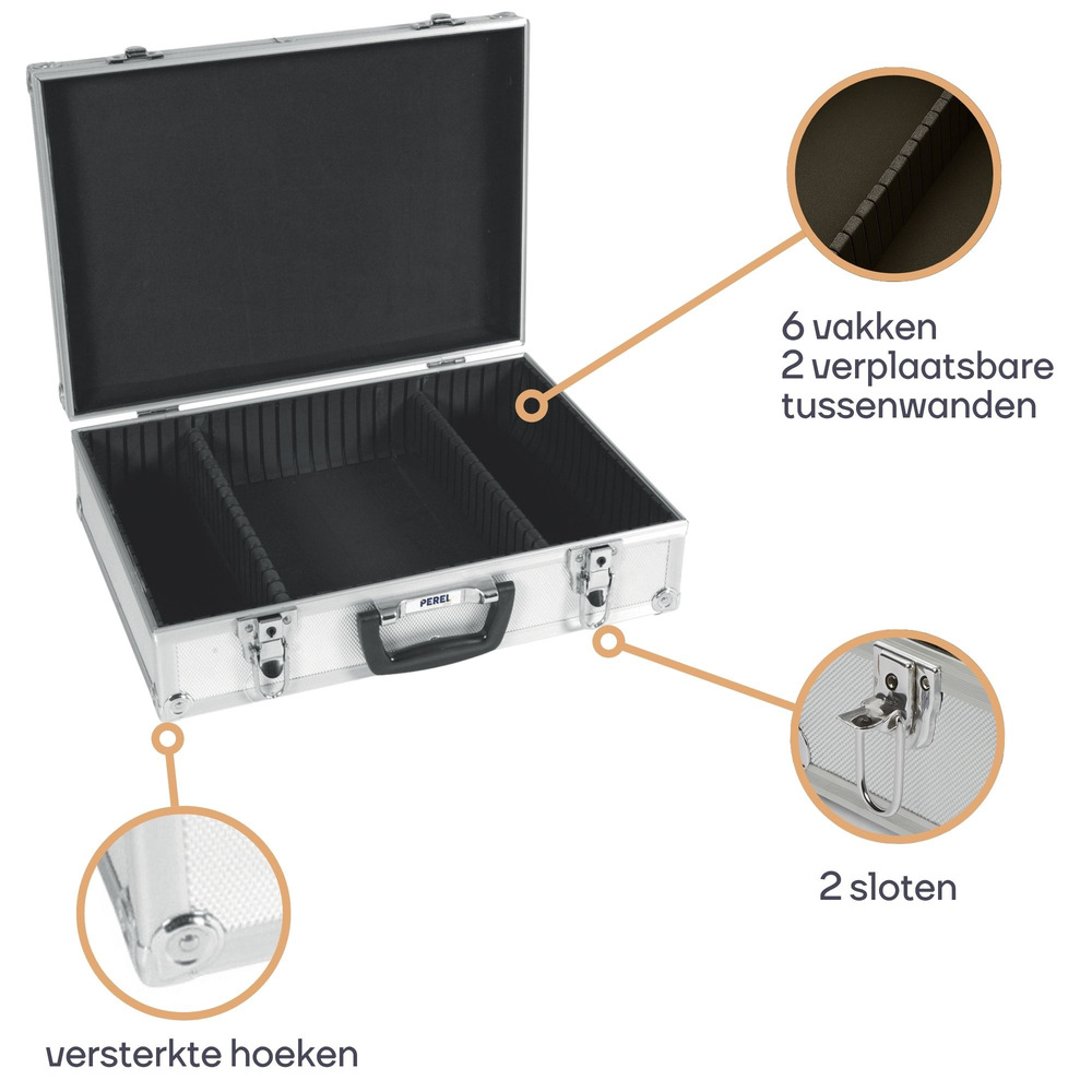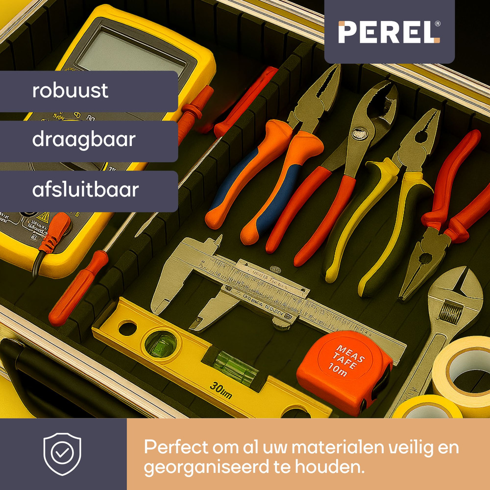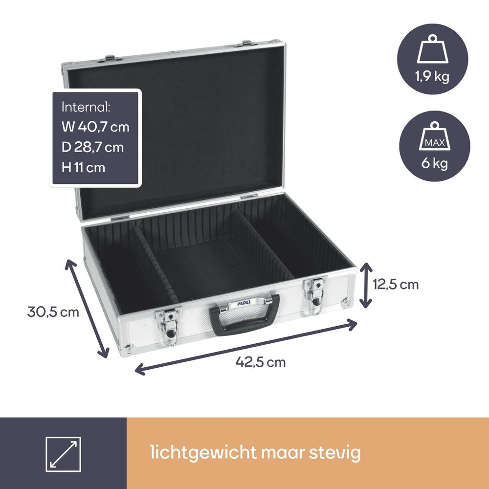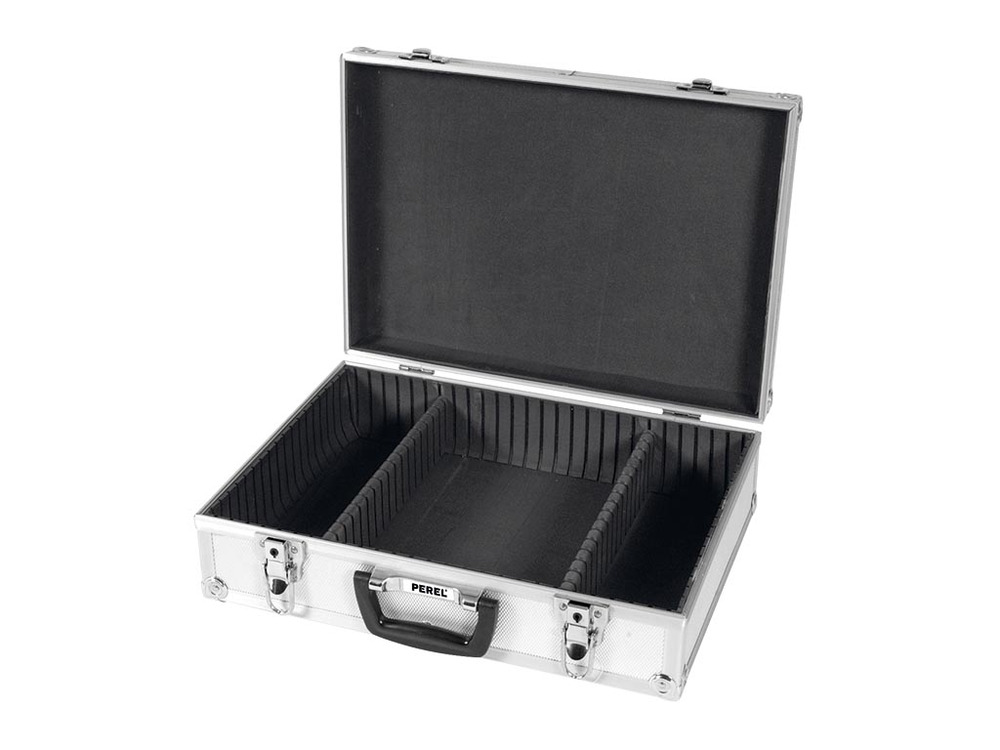 The Perel aluminum tool case measures 425 x 305 x 125 mm and offers a volume of 16.2 liters. This versatile storage solution is perfect for organizing and transporting tools and accessories.