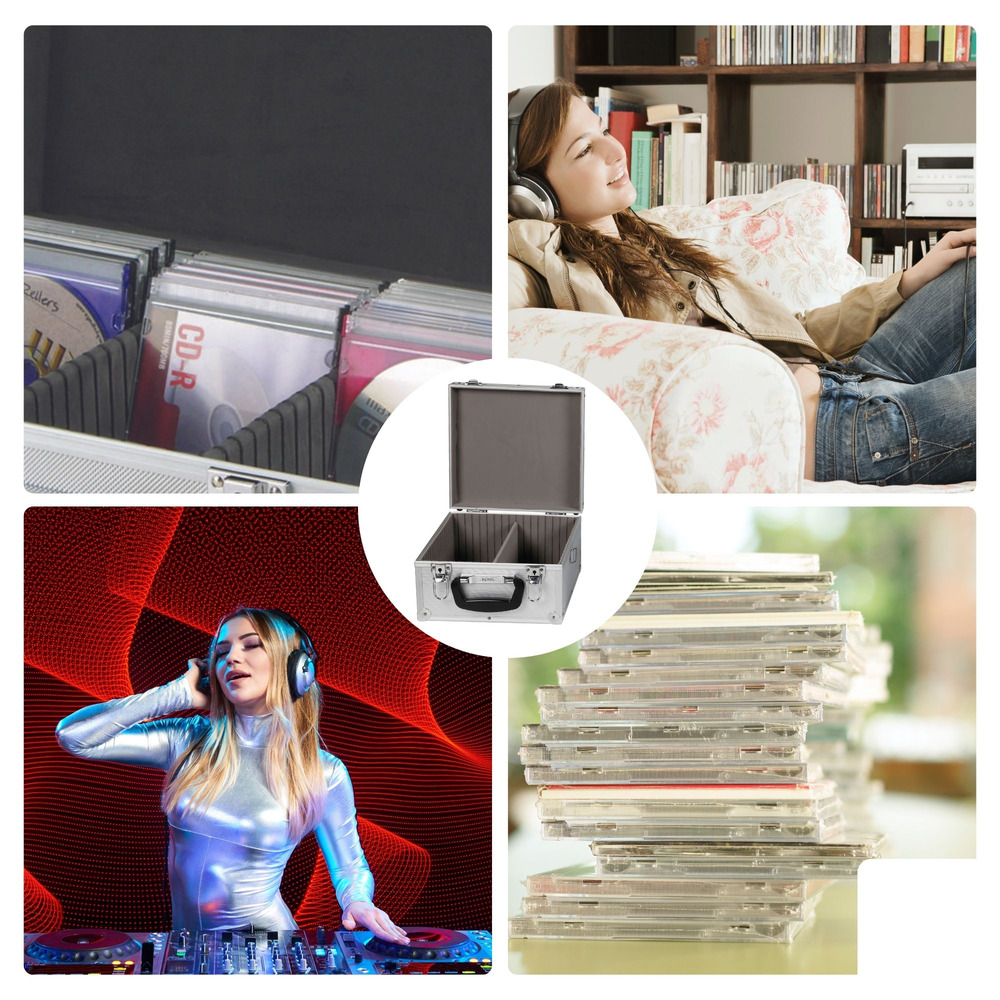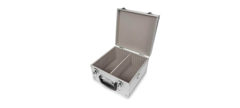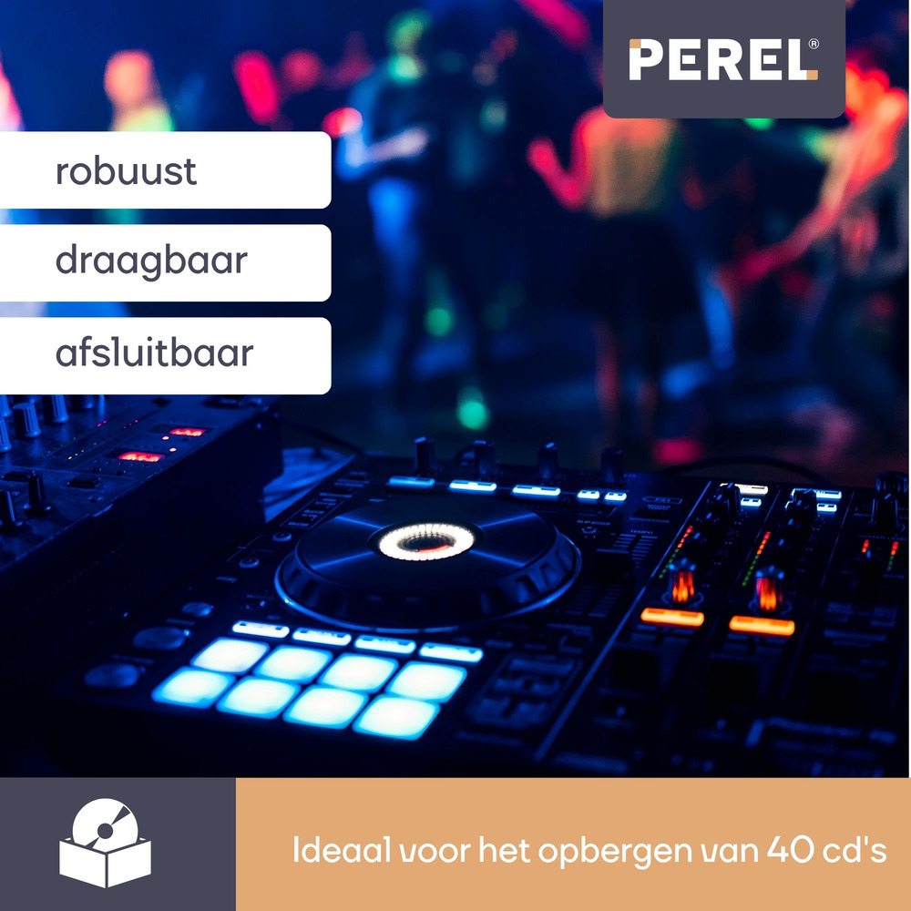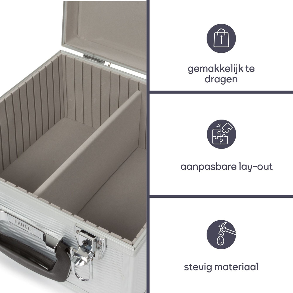 The Perel CD-Koffer, measuring 280 x 268 x 160 mm, offers a 12-liter capacity apt for organizing 40 CDs efficiently. Crafted from aluminum, this lightweight case features robust construction, ensuring durability without compromising portability.