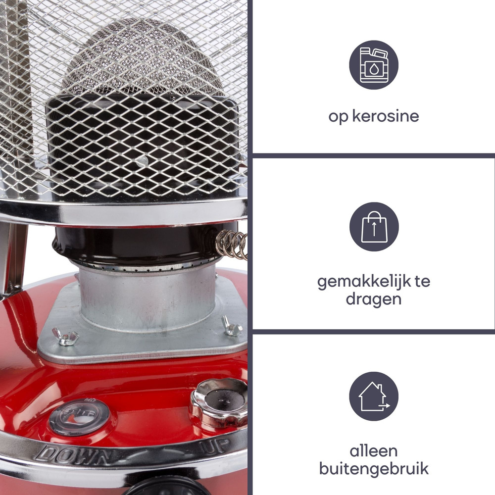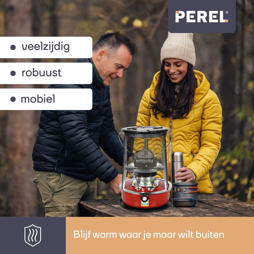 De draagbare petroleumkachel van Perel werkt op gezuiverde petroleum en is ontworpen voor gebruik buitenshuis, ideaal voor koude avonden op het terras of een kampeertrip. Met een vermogen van 2600 W biedt het toestel snelle en efficiënte verwarming.