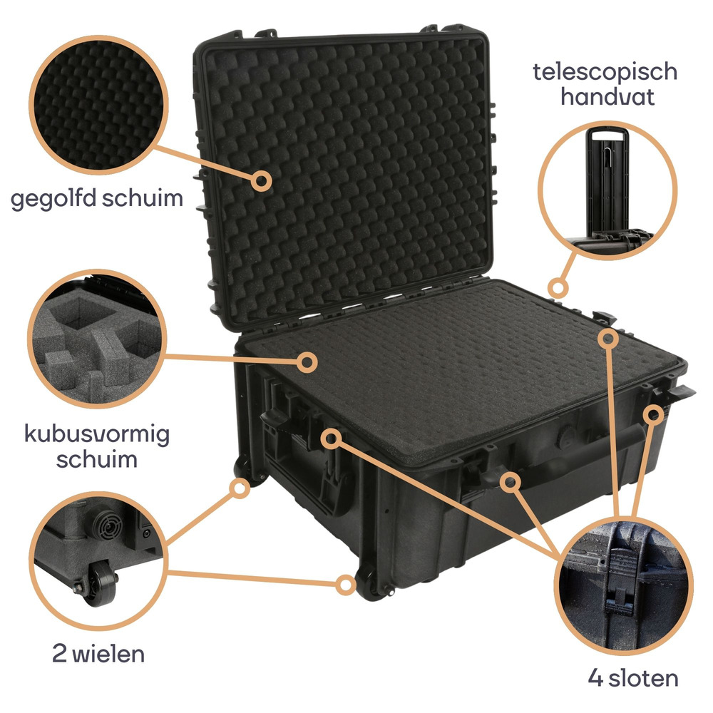 Uitgerust met plukschuim dat op maat kan worden gesneden, zorgt de binnenkant ervoor dat goederen stevig op hun plaats blijven tijdens het transport. De waterdichtheid van IP67 biedt bescherming tegen water en stof, waardoor deze koffer geschikt is voor diverse omgevingen.