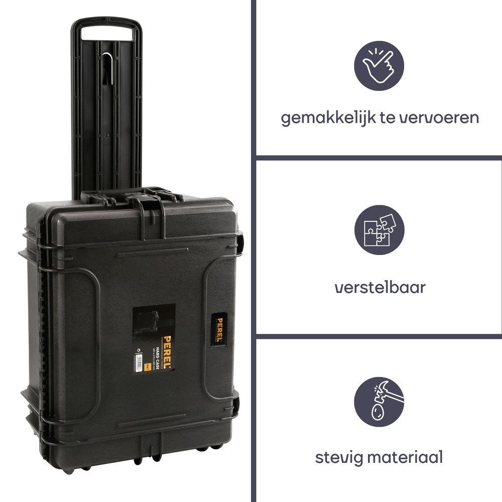 Deze harde koffer van Perel biedt een robuuste oplossing voor het veilig opbergen en vervoeren van goederen. De externe afmetingen zijn 604 x 473 x 283 mm en de inhoud van 80 liter zorgt voor voldoende ruimte.