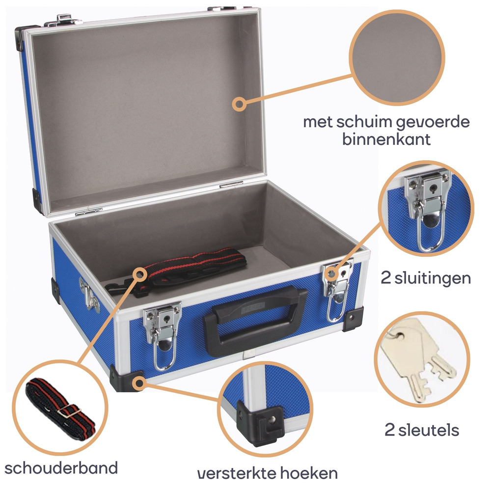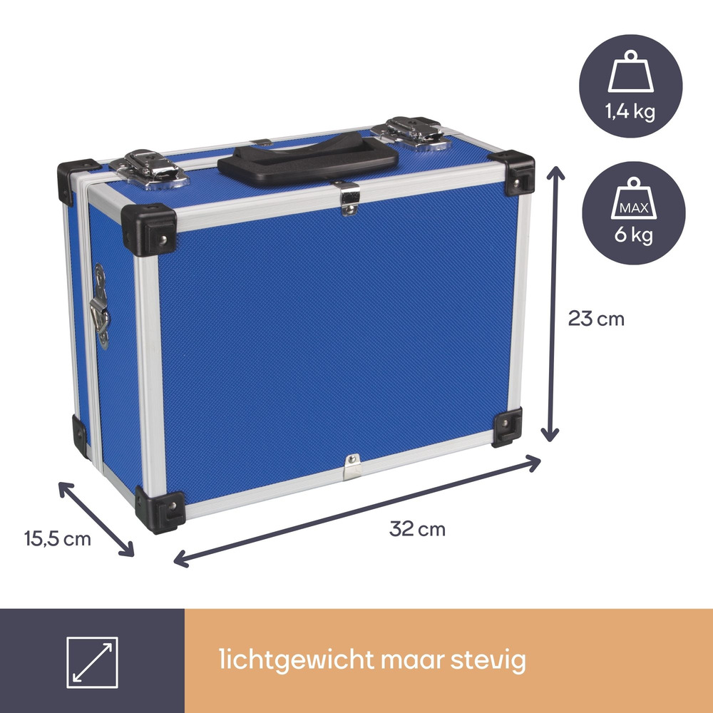 De blauwe koffer heeft een stevige, met stof beklede binnenkant voor extra demping en bescherming tegen krassen en stoten.
