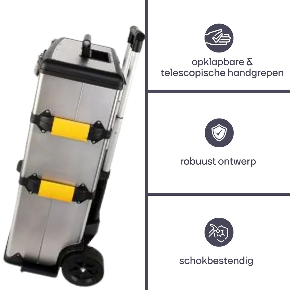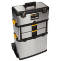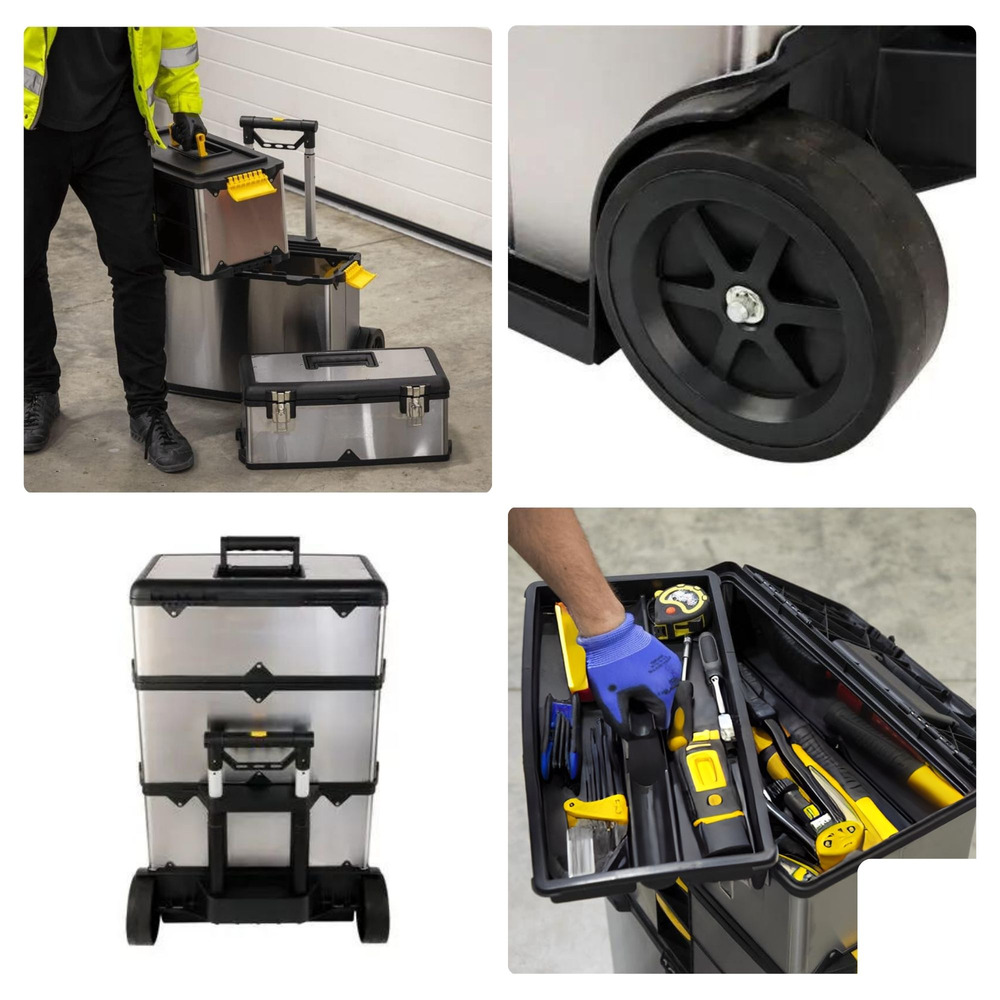 The top compartment features a removable tray for easy access to smaller tools, while the middle compartment includes two drawers for organized storage of essentials. The robust construction ensures durability, protecting tools from environmental elements.