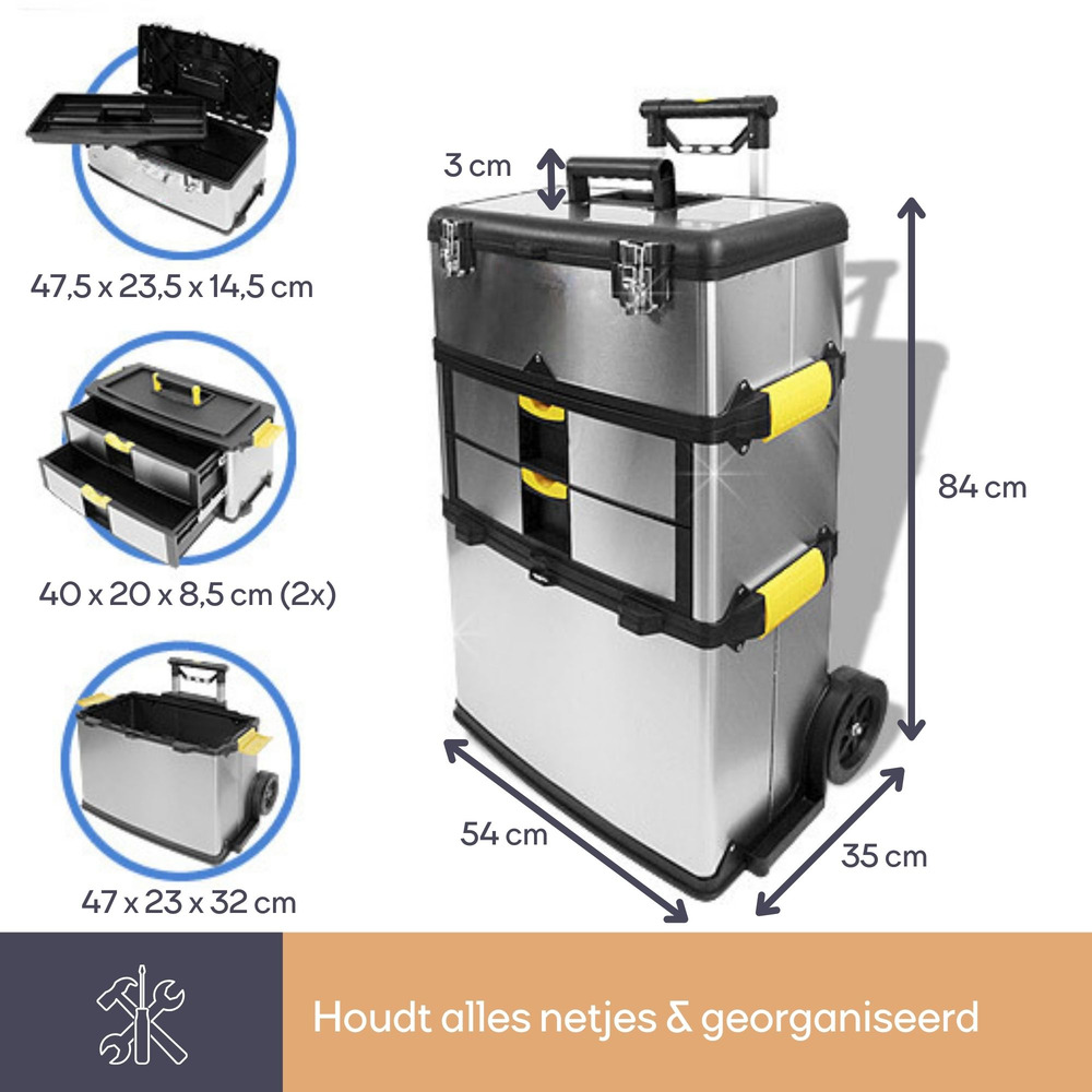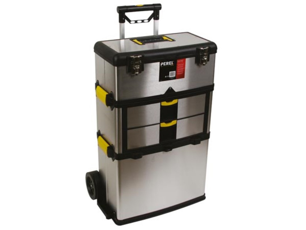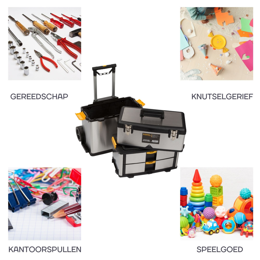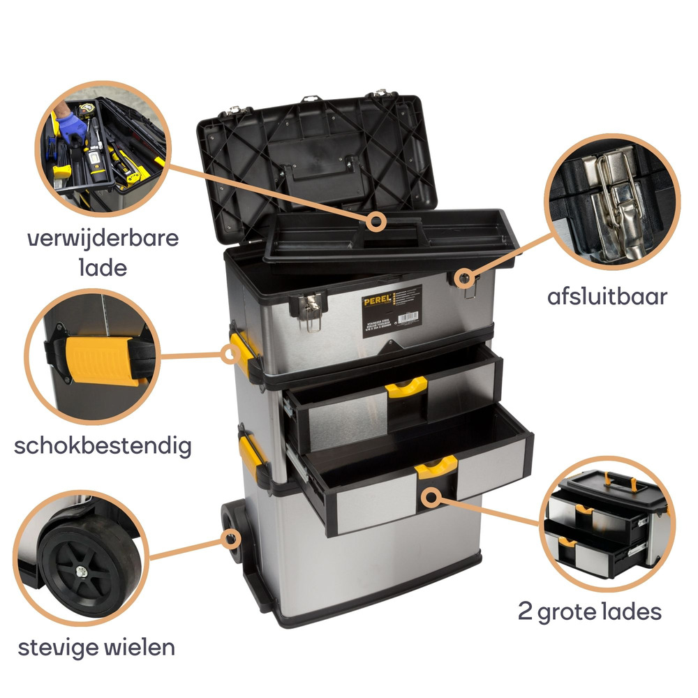 This stainless steel mobile tool chest by Perel measures 570 x 354 x 830 mm and offers a spacious 167-liter capacity. Designed for efficient tool storage, it comprises three compartments that accommodate different types of equipment with ease.