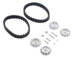 This track set includes a pair of 30-tooth silicone tracks, two white drive sprockets measuring 35 mm (1.4″) in diameter, and two matching idler sprockets along with mounting hardware. To work properly with the track, the drive and idler sprockets should be set up approximately 85 mm (3.35″) apart. The drive sprockets are designed to work with 3mm D-shafts, which are found on micro metal gearmotors and mini plastic gearmotors. These are the same sprockets as on the Zumo chassis and robots, just in a different color and with a longer track.