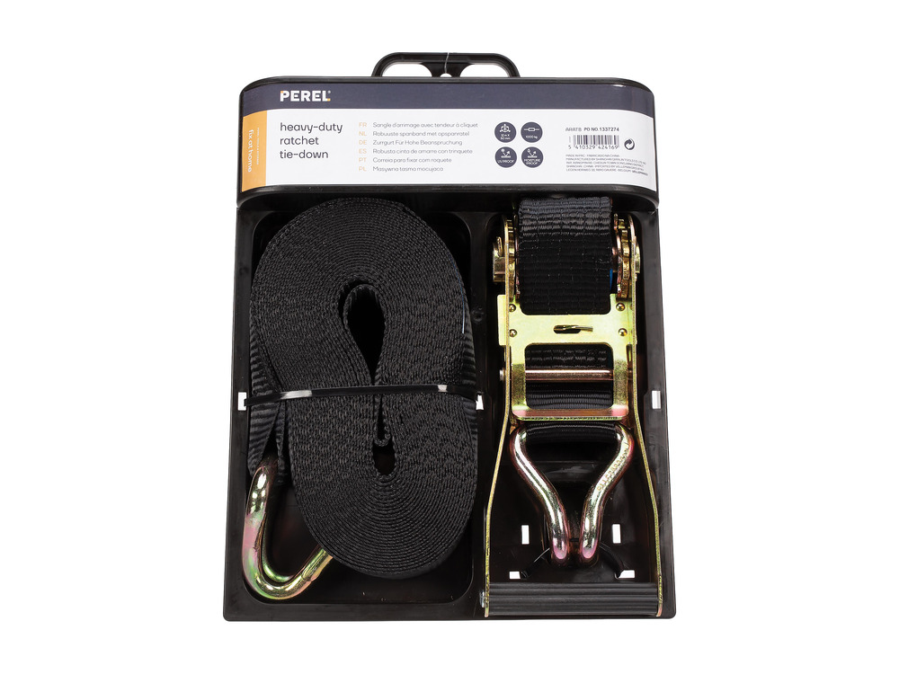 This robust lashing strap with a ratchet mechanism ensures secure load fastening with a break strength of 1000 kg. It is crafted from high-quality materials to withstand heavy-duty use.