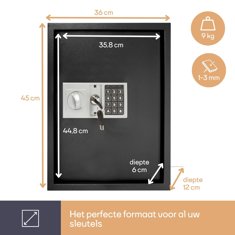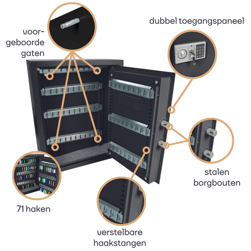 Designed to streamline key management, this sleutelkluis accommodates up to 71 keys securely. Measuring 45x36x12 cm, it's compact yet spacious, ideal for organizing keys efficiently in both home and office settings.