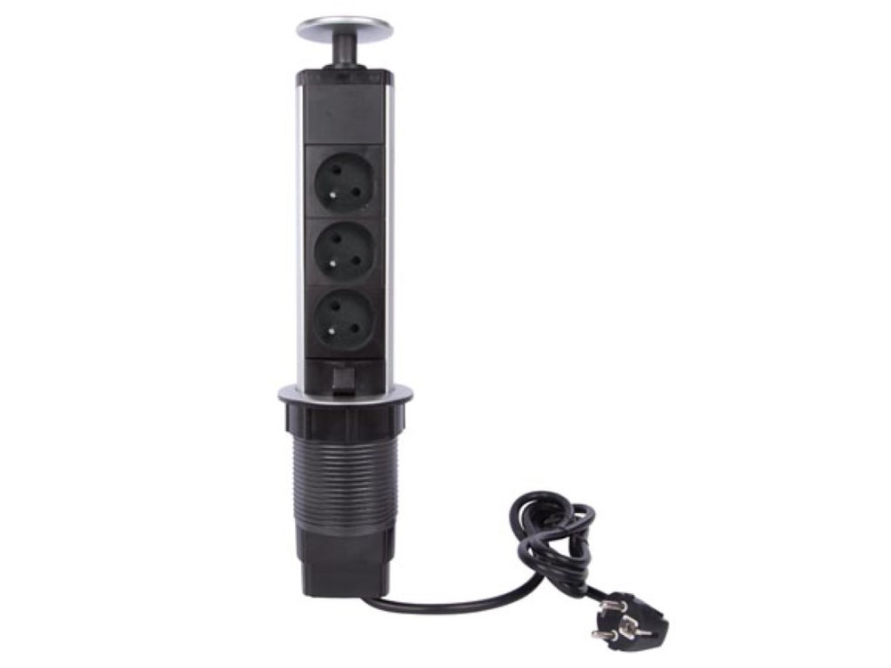 Transform cluttered spaces with this pop-up power strip, featuring three grounded outlets. Its sleek, retractable design easily integrates into countertops or workstations, offering a seamless power solution that vanishes when not needed.